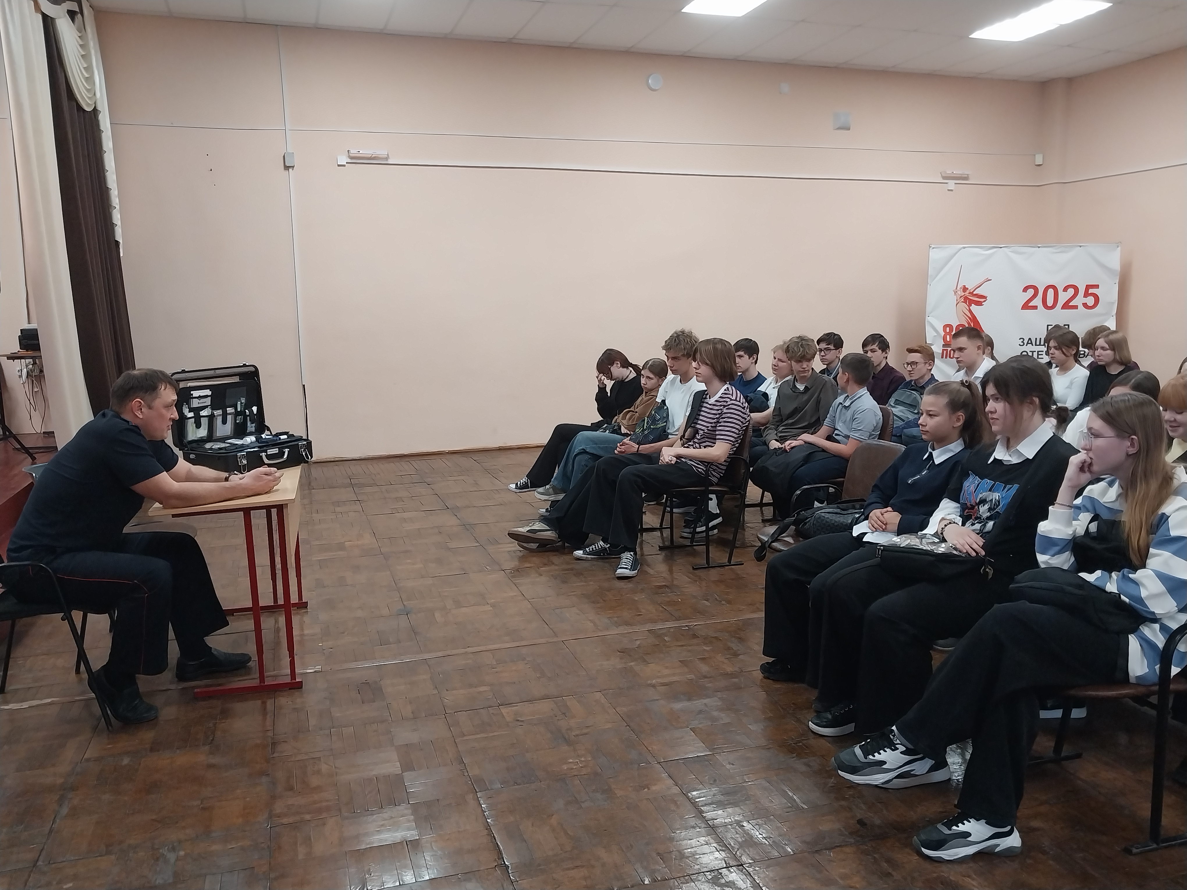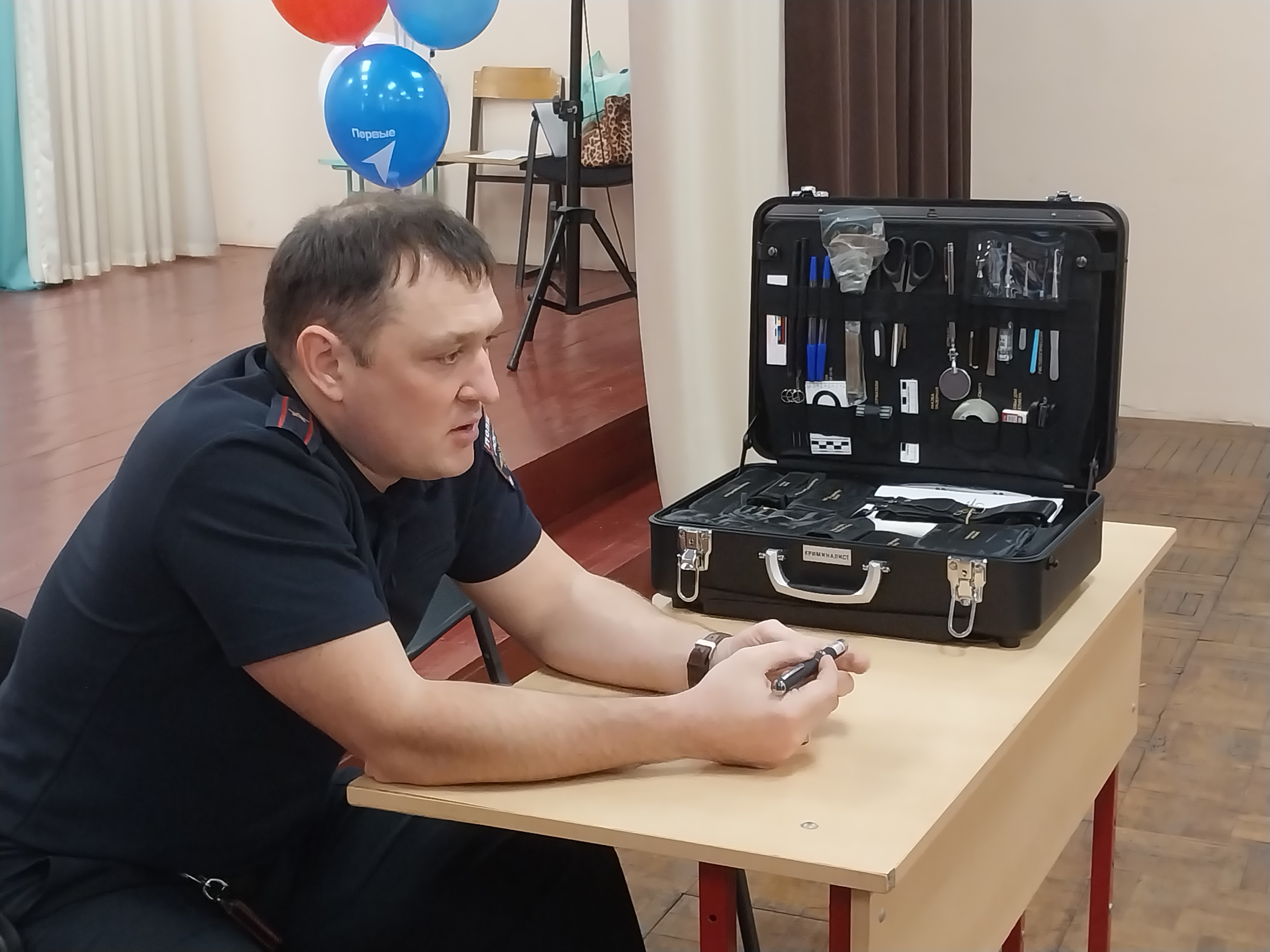 Начальник экспертно-криминалистического отдела ОМВД России по г. Киселевску, майор полиции Егор Александрович Никитюк раскрыл содержимое криминалистического чемоданчика, рассказал школьникам о том, как происходит работа эксперта на месте преступления, о разных видах экспертиз, проводимых в криминалистической лаборатории, и о многом другом.