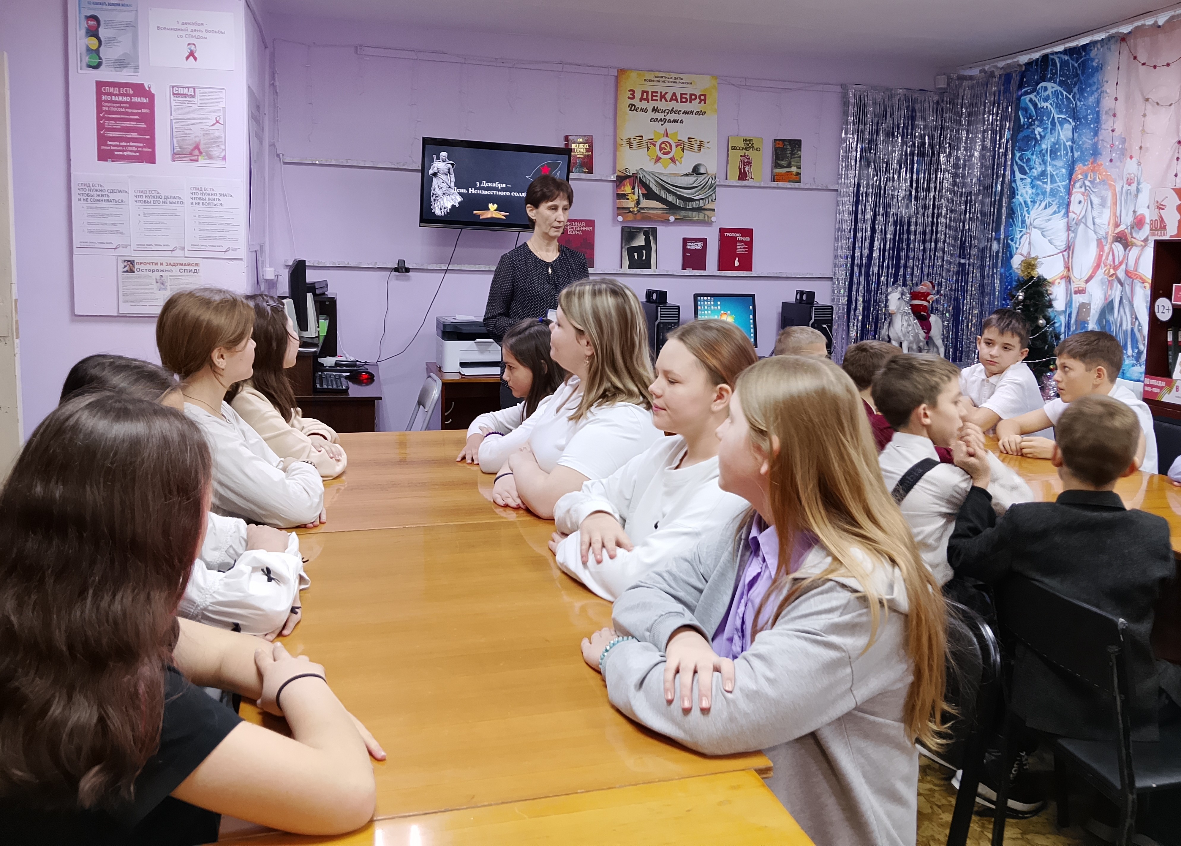 В преддверии Дня Неизвестного Солдата, в Год защитника Отечества, в сельской библиотеке-филиале № 10 прошел час памяти «Я в том бою остался». Подростки познакомились с историей возникновения этой памятной даты. Библиотекарь рассказала о том, почему именно 3 декабря было выбрано для сохранения памяти о воинской доблести, а также об уникальном мемориале «Могила Неизвестного Солдата», который стал символом памяти о всех тех, кто не вернулся с полей сражений.