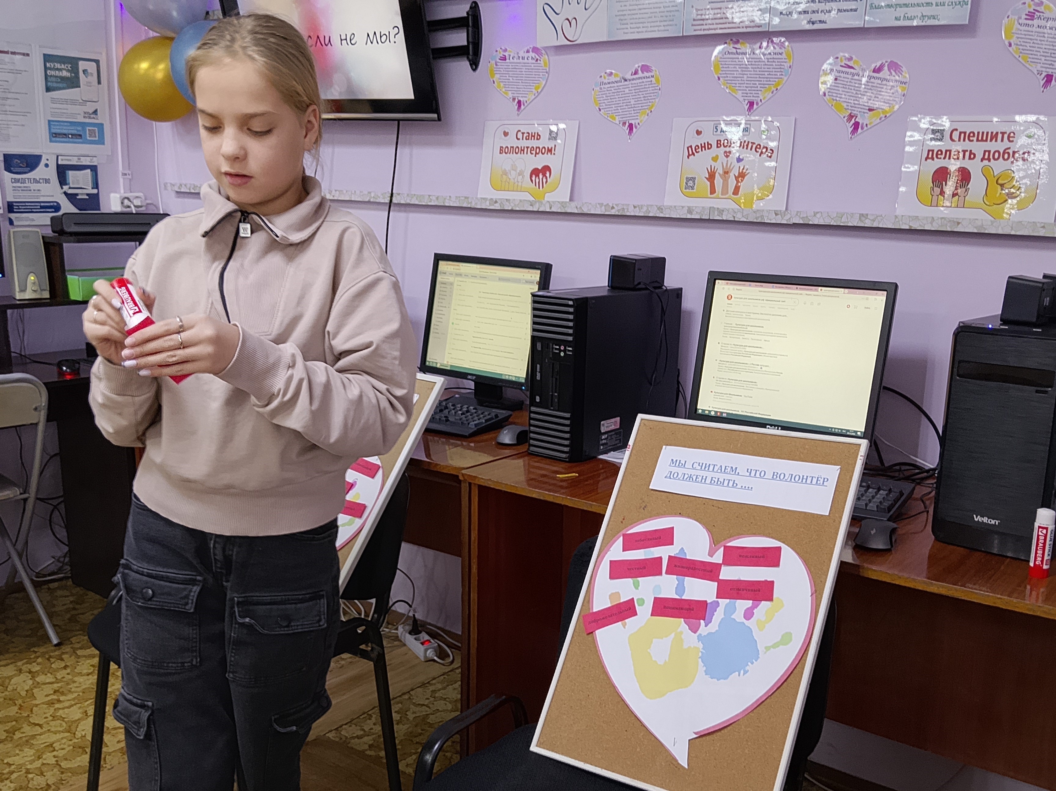 Учащиеся с большим интересом посмотрели фрагмент мультфильма «Рука помощи», который стал отличным дополнением к обсуждаемой теме. В рамках конкурса «Каким должен быть волонтер» ученики, используя карточки с прилагательными, создали своеобразный «Портрет настоящего волонтера», заполнив сердце качествами, которые, по их мнению, должны быть присущи каждому добровольцу.