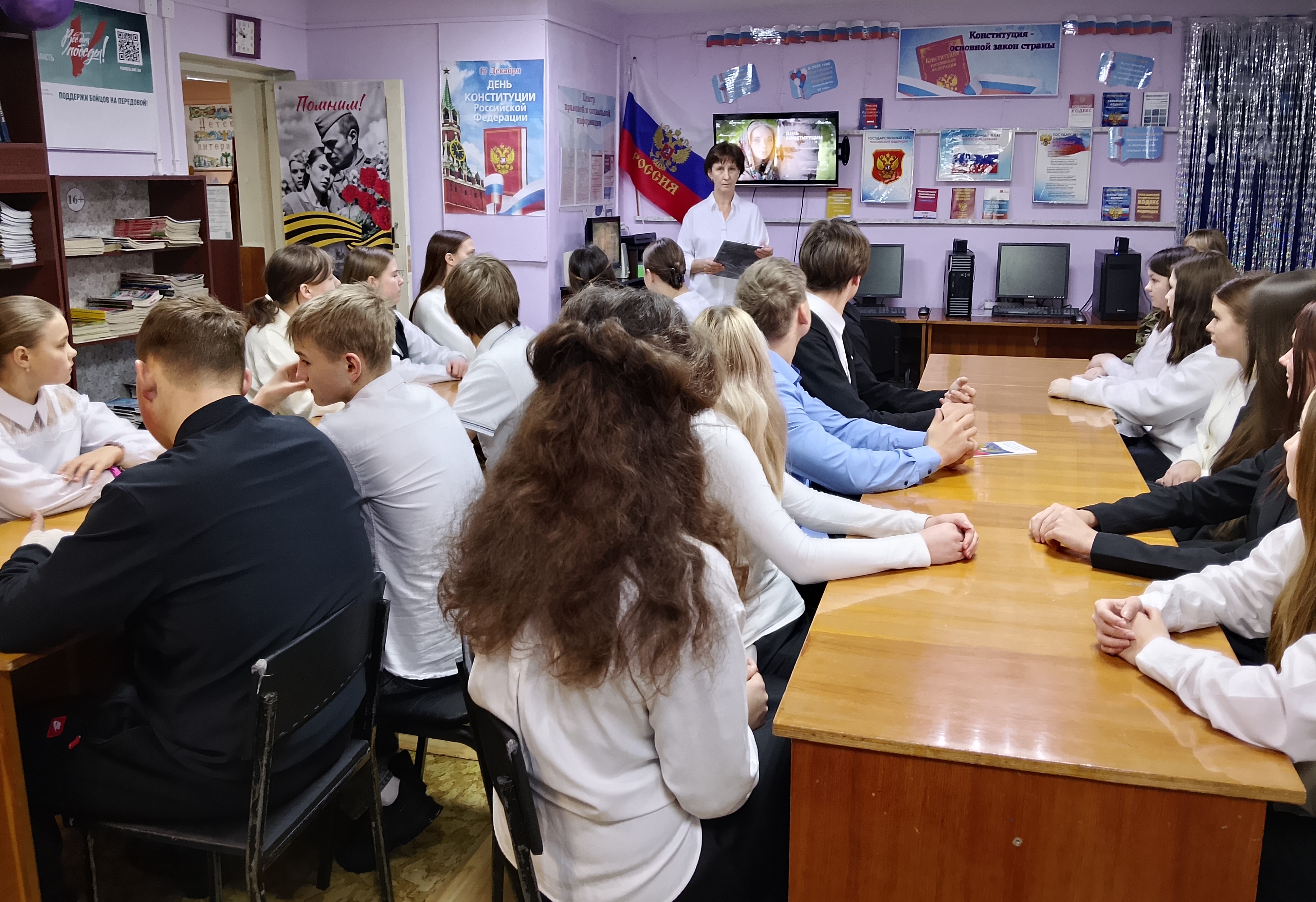 К этому важному событию в сельской библиотеке-филиале № 10 был проведен урок правовой грамотности «Конституция – основной закон, по которому живем» для учащихся девятых классов школы № 30. Данное мероприятие стало отличной возможностью для молодежи углубить свои знания о Конституции и её значении в жизни каждого гражданина. В качестве приглашённого эксперта выступила Исхакова Наталья Юрьевна, военный юрист и руководитель Киселёвского городского отделения Всероссийского молодежного движения «Волонтёрская Рота Боевого Братства».