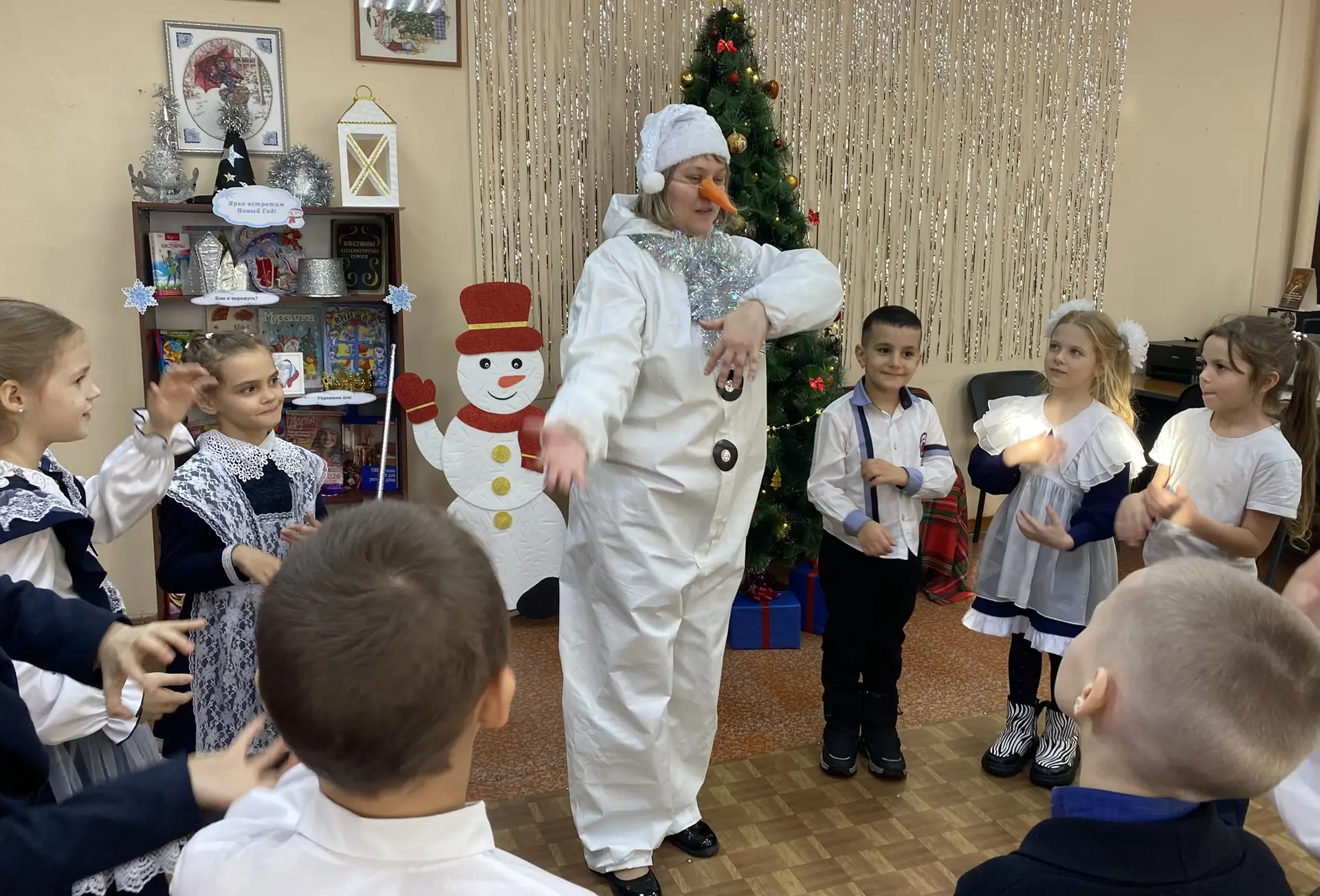 В гости к ребятам заглянул Снеговик. Школьники разгадывали головоломки и отвечали на вопросы викторины, посвященной зимним сказкам В. Г. Сутеева. Мальчишки и девчонки с большим удовольствием приняли участие в музыкальных и активных играх «Лепим, лепим ком большой» и «Назови новогодний символ», проявляя знания о новогодних традициях. Чаще всего звучали слова: «ёлка», «подарок», «мандаринка», а пожелания были в форме «удачи», «крепкого здоровья» и «отличного самочувствия».