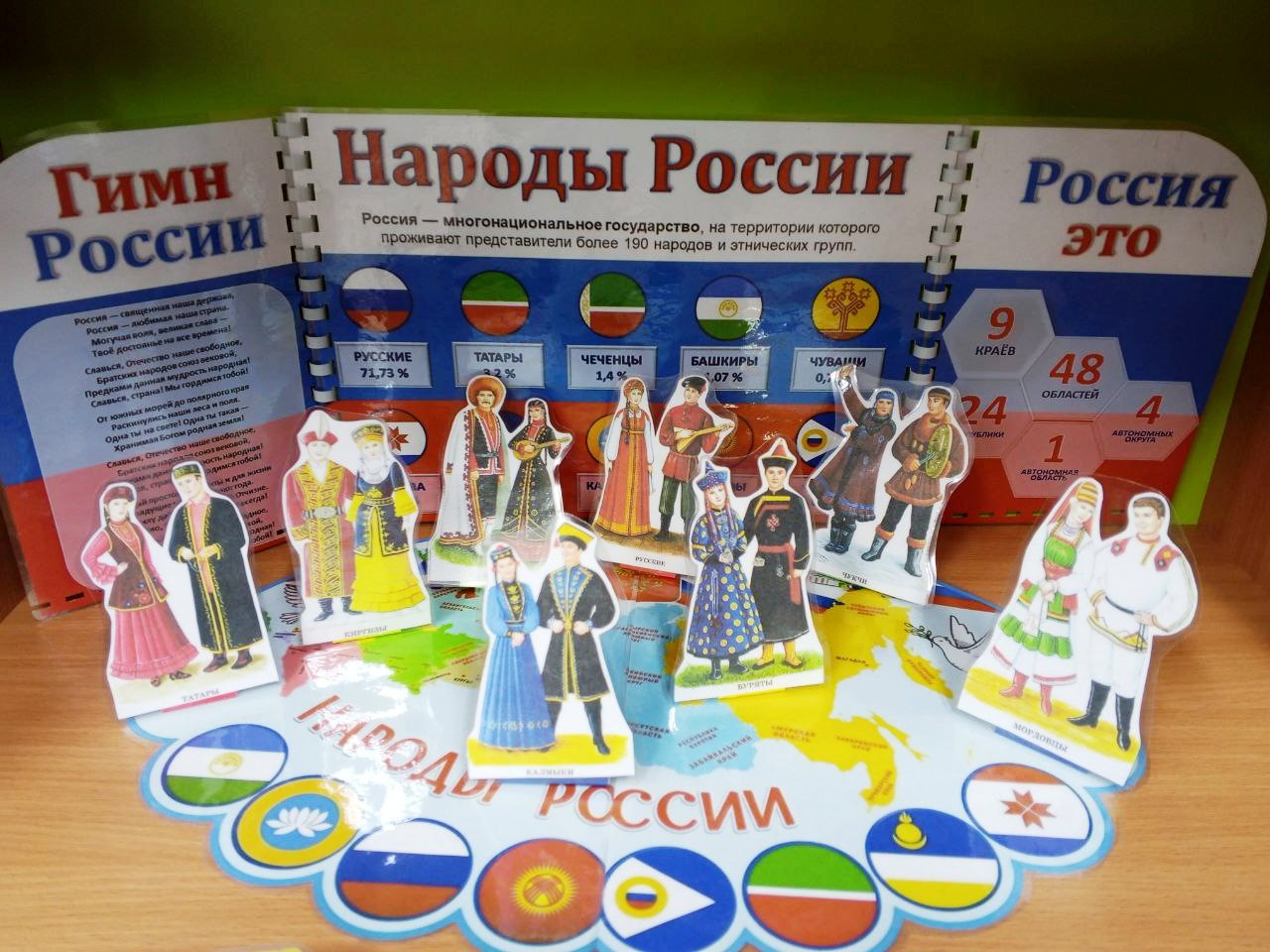 В разделе выставки «Из нас слагается народ» представлены сведения о национальном составе России, приведены примеры флагов и национальных костюмов разных народов. Чтобы правильно соотнести народность и флаг, необходимо внимательно ознакомиться с информационной книжкой-раскладушкой.