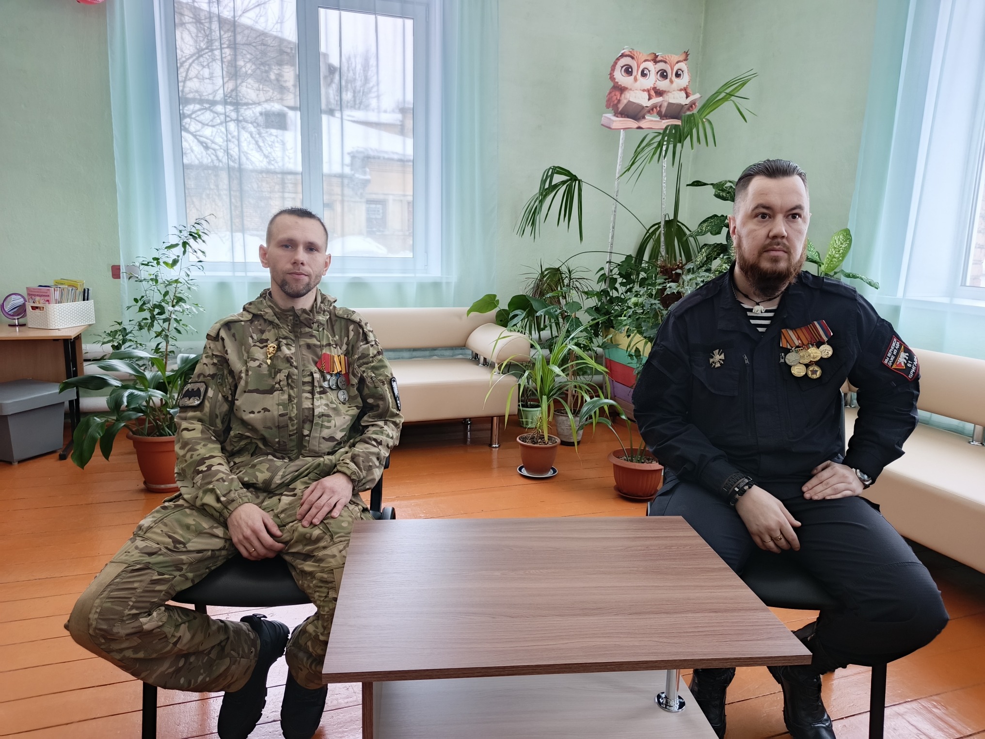 Библиотекари представили школьникам представителей Кемеровской региональной общественной организации ветеранов локальных войн и воинской чести «Паритет», участников специальной военной операции - Александра Александровича Горшкова, участника миротворческой миссии по возвращению Крыма в состав России, члена Союза добровольцев Донбасса и Сергея Александровича Ионина, штурмовика-разведчика, в настоящее время находящегося в отпуске.