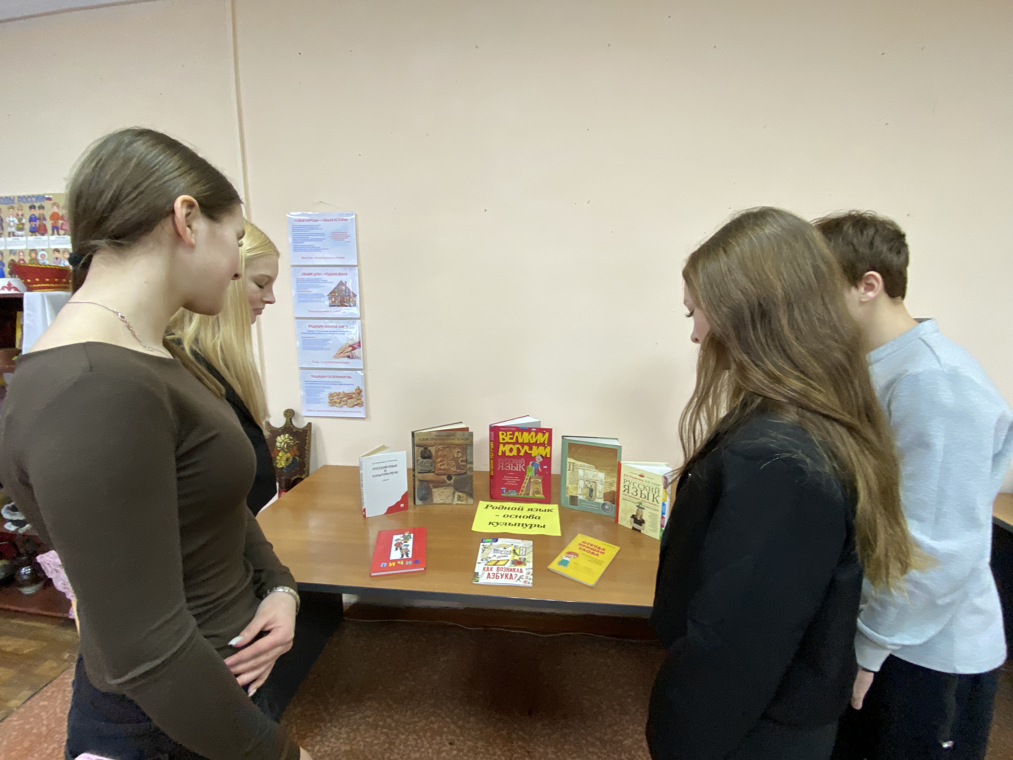 Познавательная программа завершилась обзором книжной выставки «Родной язык – основа культур», на которой были представлены разнообразные справочные издания по русскому языку, а также увлекательные сборники головоломок, народных мудростей, пословиц и поговорок.