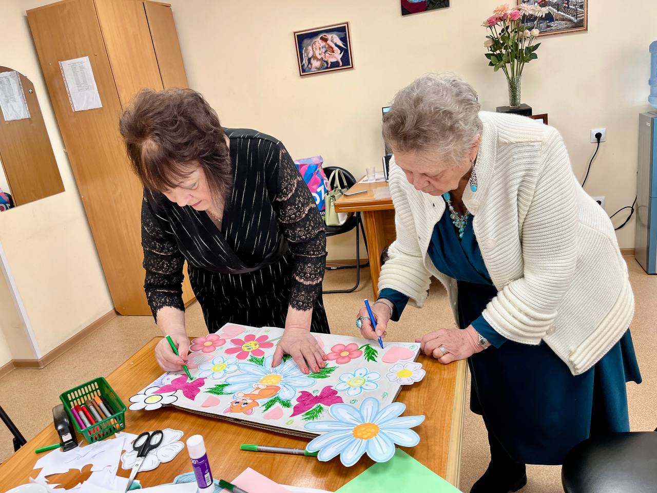 Кульминацией вечера стал, пожалуй, самый любимый этап — мастер-класс по созданию авторских открыток. Милые дамы разделились на команды, и в ход пошла вся фантазия. За столами кипела работа: из цветной бумаги, лент, бусин и кружев рождались маленькие шедевры. Весенние мотивы раскрылись во всем своем многообразии: на открытках распускались нежные тюльпаны и мимозы, порхали яркие бабочки и, конечно, нашлось место для исконно русской красавицы-матрешки. А особый уют и умиление добавили пушистые коты, которые, словно предчувствуя тепло, «поселились» на многих работах, напоминая, что самый лучший подарок — тот, что сделан с душой и улыбкой.