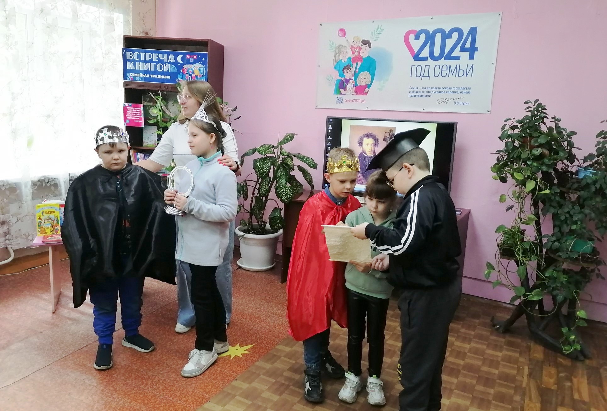 Подсказкой к правильным ответам служили книги с выставки «Ни пером описать…». Оказалось, что ребята хорошо знают: «Сказку о попе и его работнике Балде», «Сказку о рыбаке и рыбке», «Сказку о золотом петушке», «Сказку о мертвой царевне и семи богатырях». Поэтический батл «Покажи сказку» вызвал восторг у детворы, они с удовольствием примеряли костюмы сказочных героев: «Королевича Елисея», «Ученого Кота», «Царевны» и др.