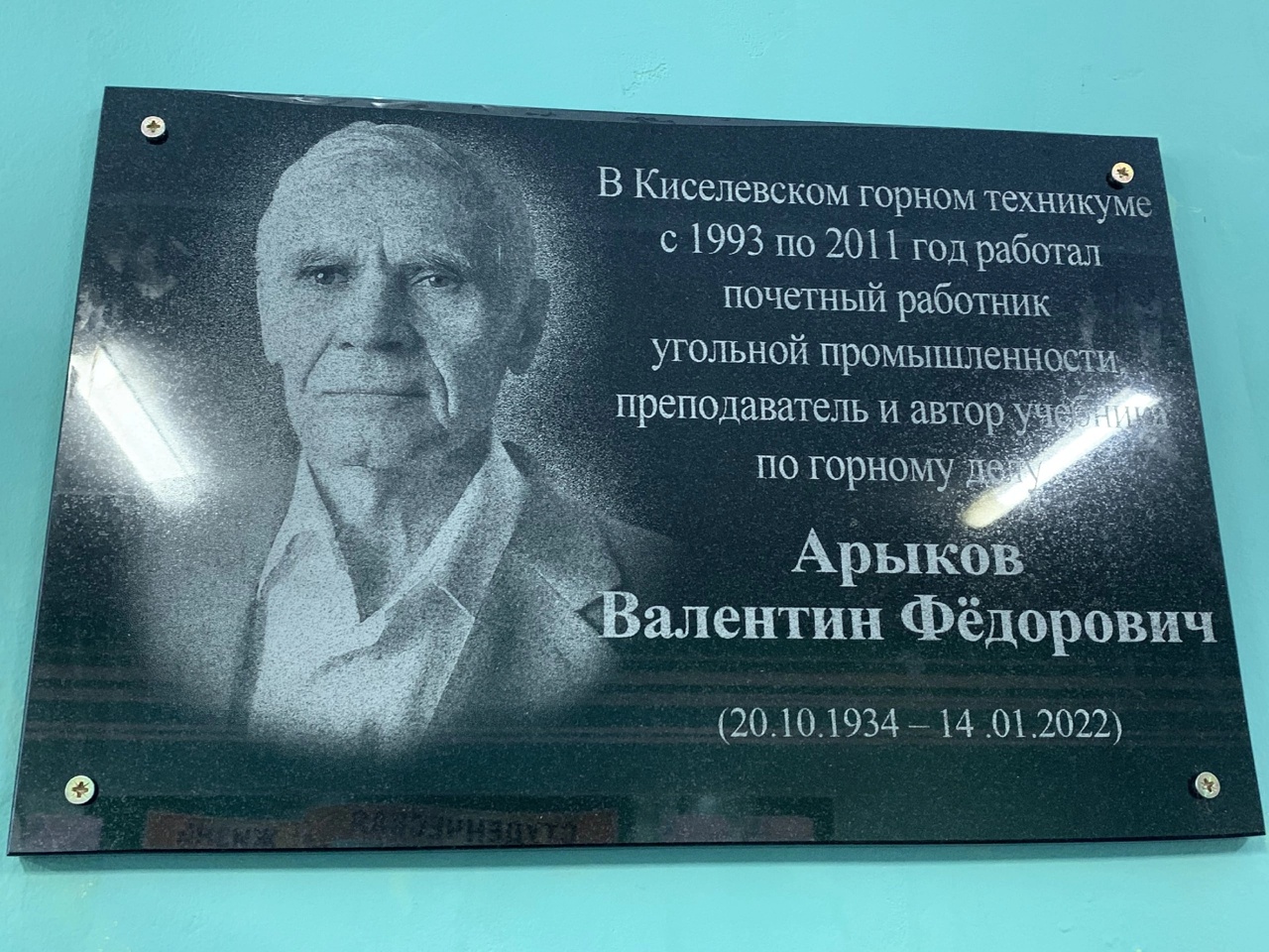 19 октября 2023 года в здании Киселевского горного техникума установлена мемориальная доска и увековечена память о почетном работнике угольной промышленности Арыкове Валентине Федоровиче.