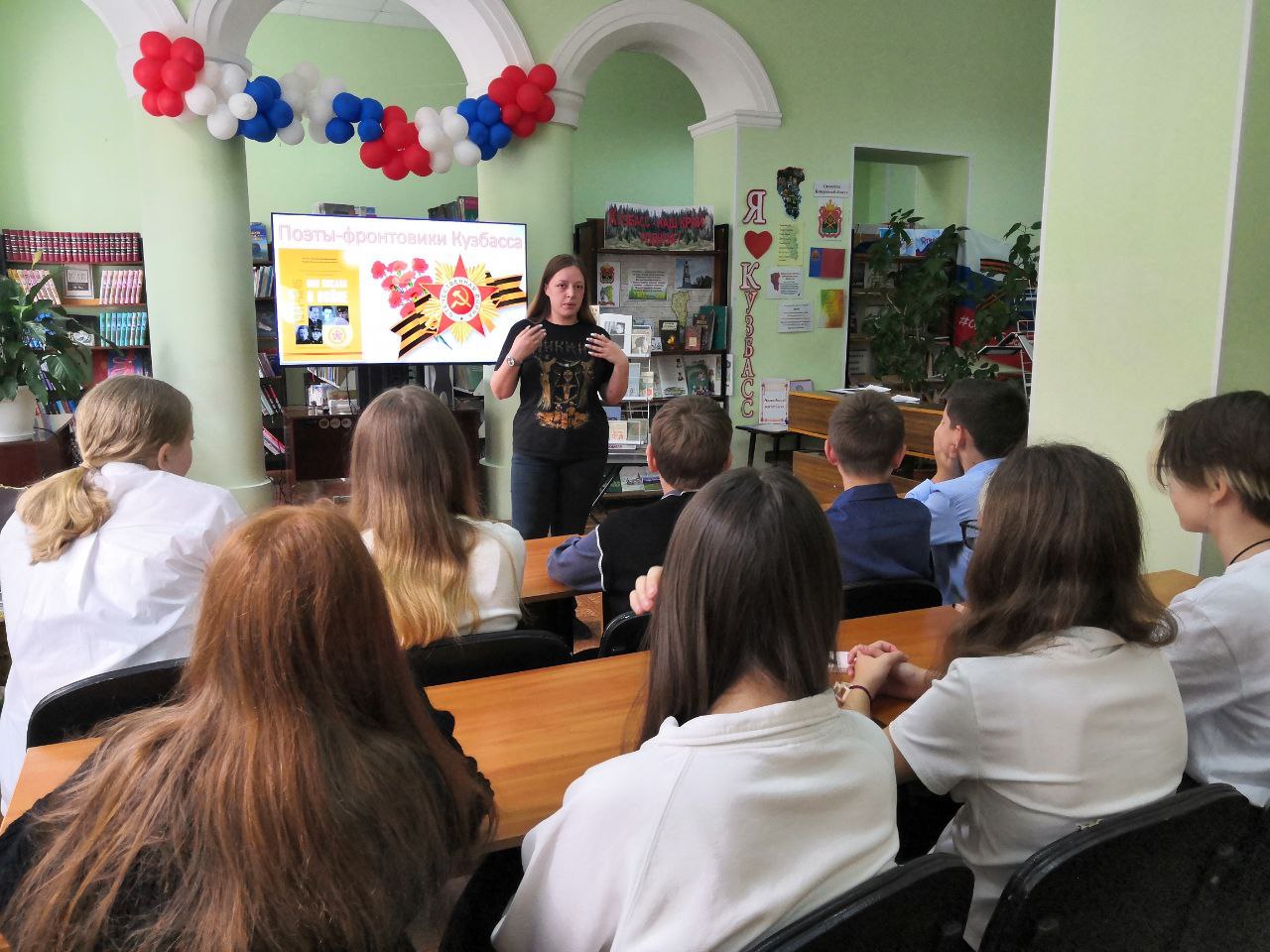 Тема войны – ведущая тема в творчестве поэтов-фронтовиков. Школьникам пояснили, что после окончания Великой Отечественной войны в своих произведениях поэты рассказывали о героических военных событиях, непосредственными участниками которых были сами. Мероприятие сопровождалось слайд-презентацией «Кузбасские поэты-фронтовики», фрагментами документальных фильмов, прочтением стихотворений поэтов-фронтовиков.