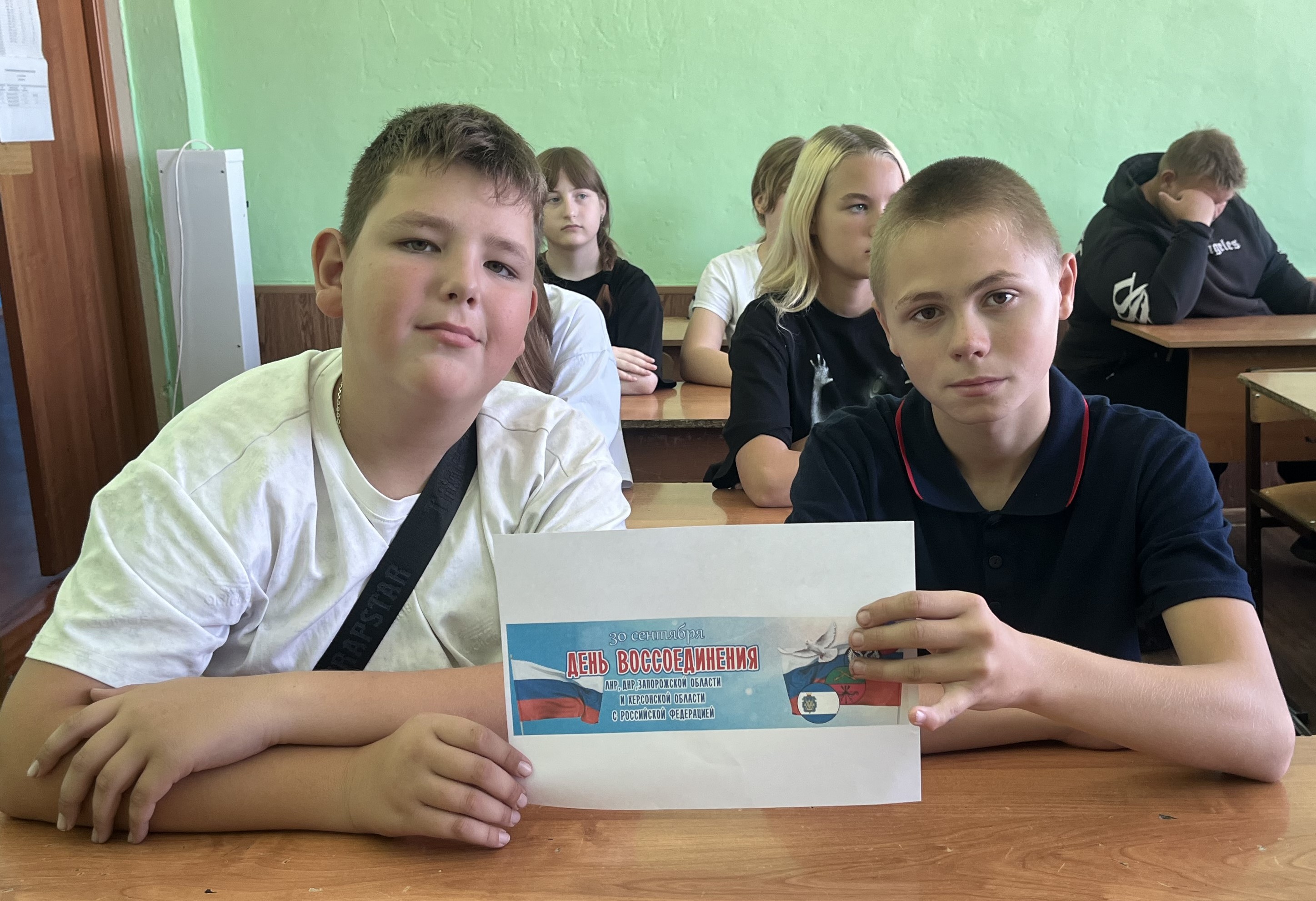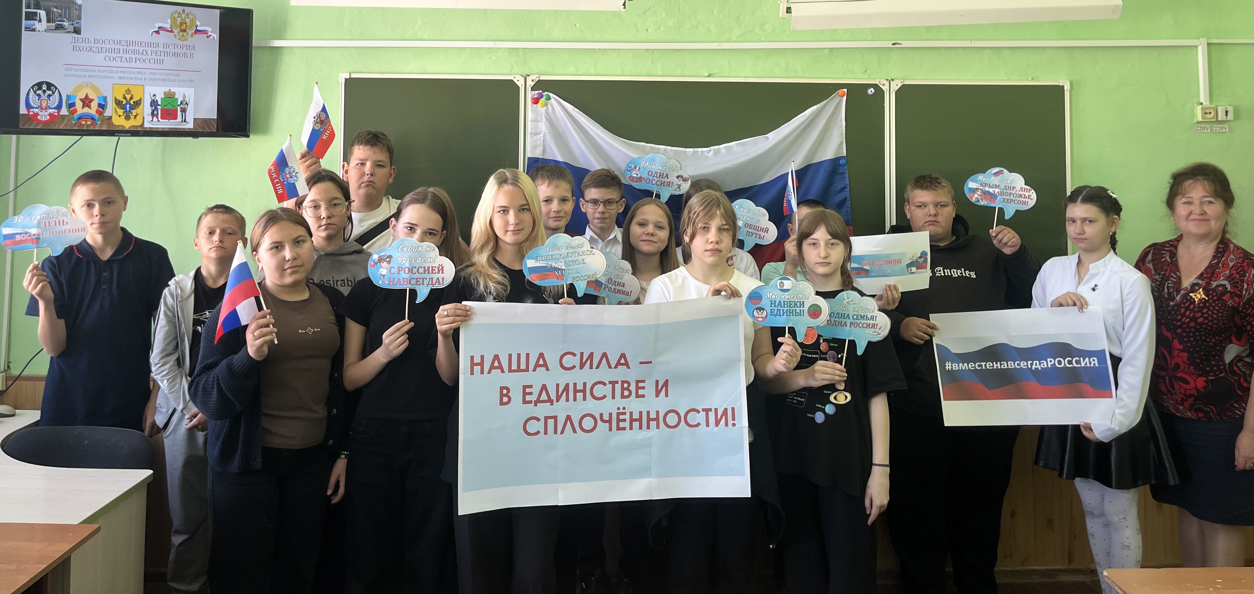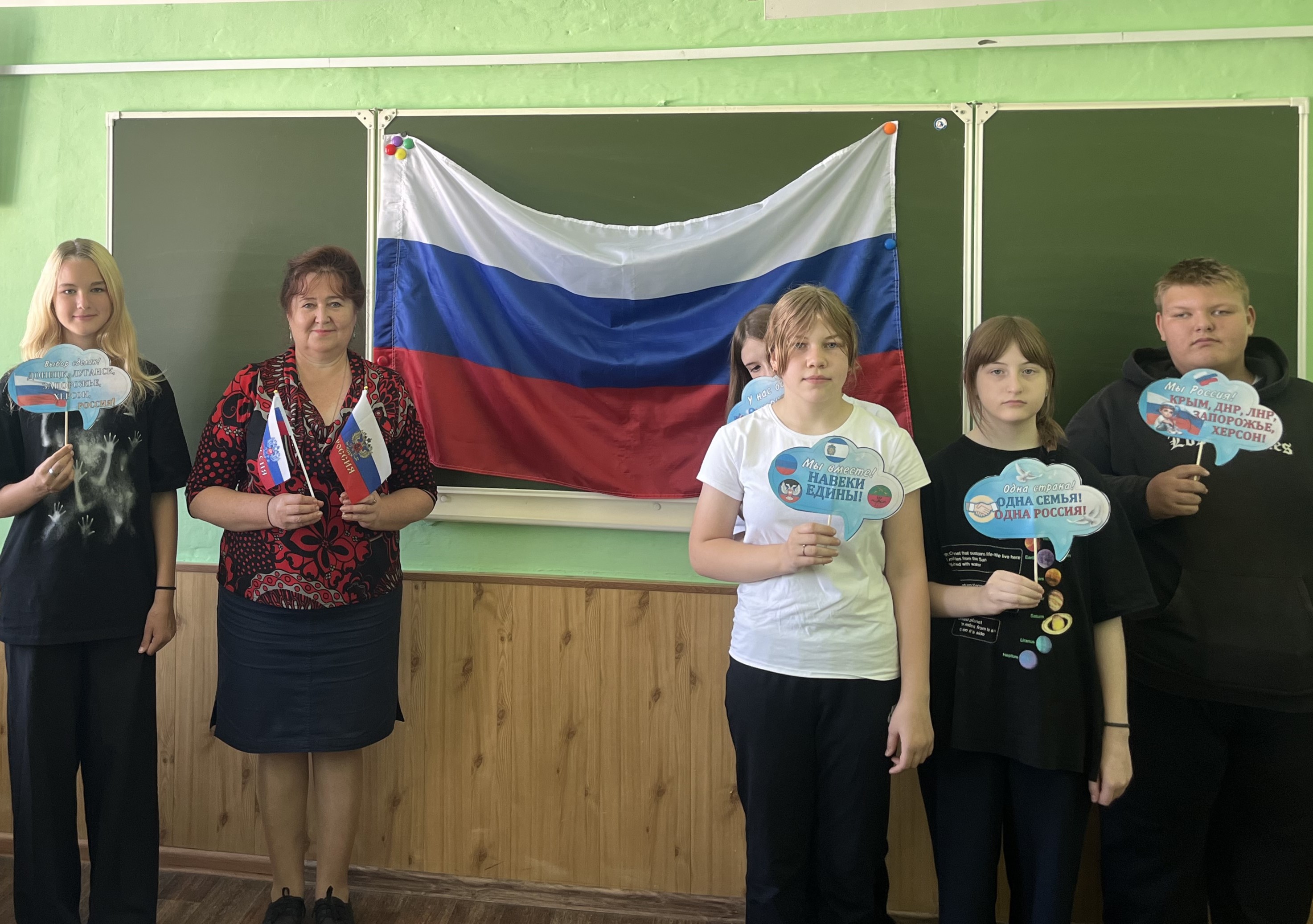 Семиклассники не просто узнали о памятной дате, празднике радости, гордости и надежды, но и как подрастающее поколение озвучили важные для всех граждан любимой Родины слова: «Мы Россия! ДНР, ЛНР, Запорожье, Херсон!», «Одна страна! Одна семья! Одна Россия!», «Один народ! Одна Россия!».