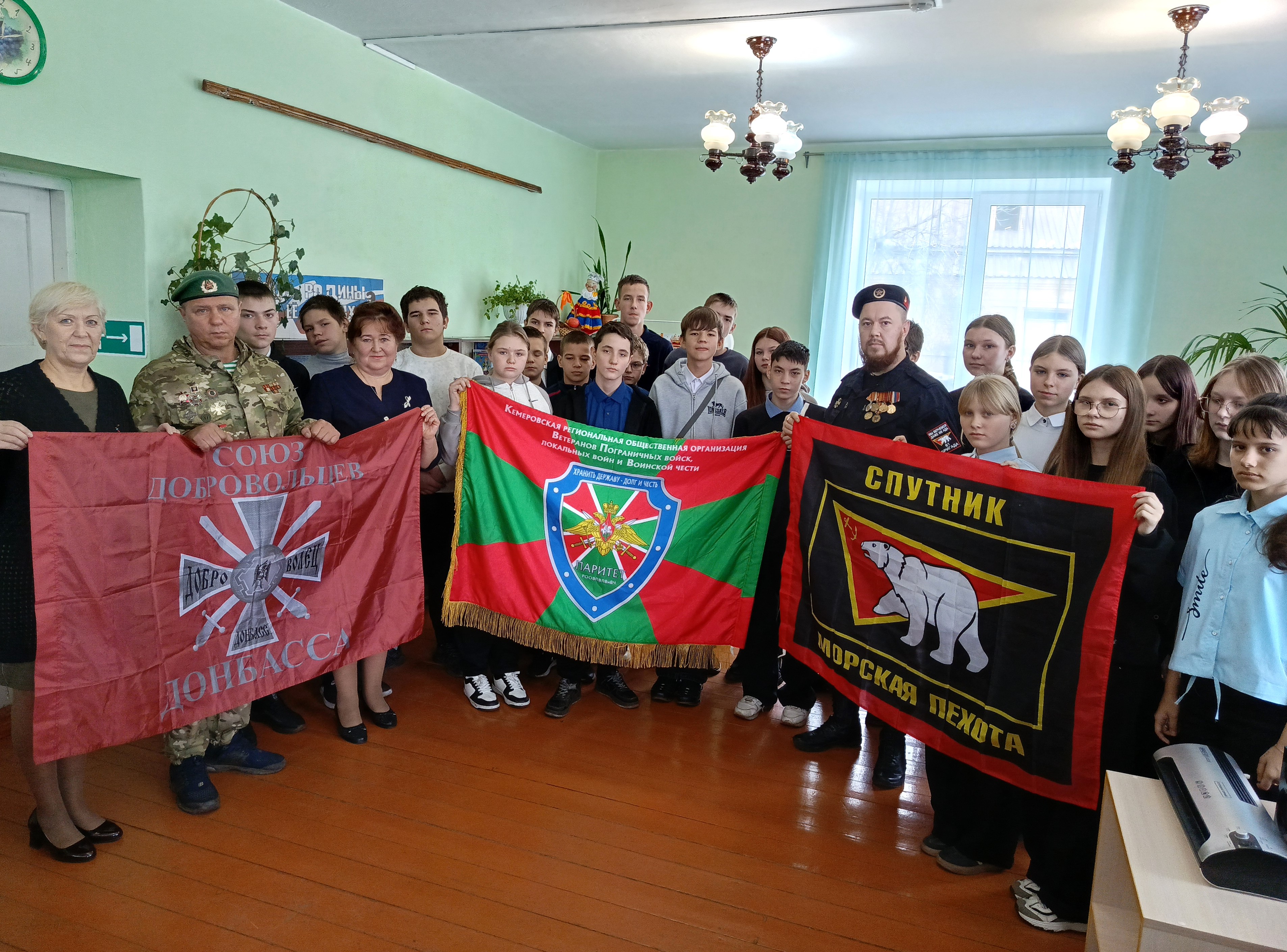 Школьной аудитории представили дорогих гостей, наших современников, воинов, участников СВО, проявившим отвагу и героизм при выполнении боевых задач. Среди них Петр Александрович Полосухин, председатель Кемеровской региональной общественной организации ветеранов пограничных войск, локальных войн и воинской чести «Паритет», участник Афганской войны, Александр Александрович Горшков, участник крымских событий, член Союза добровольцев Донбасса.