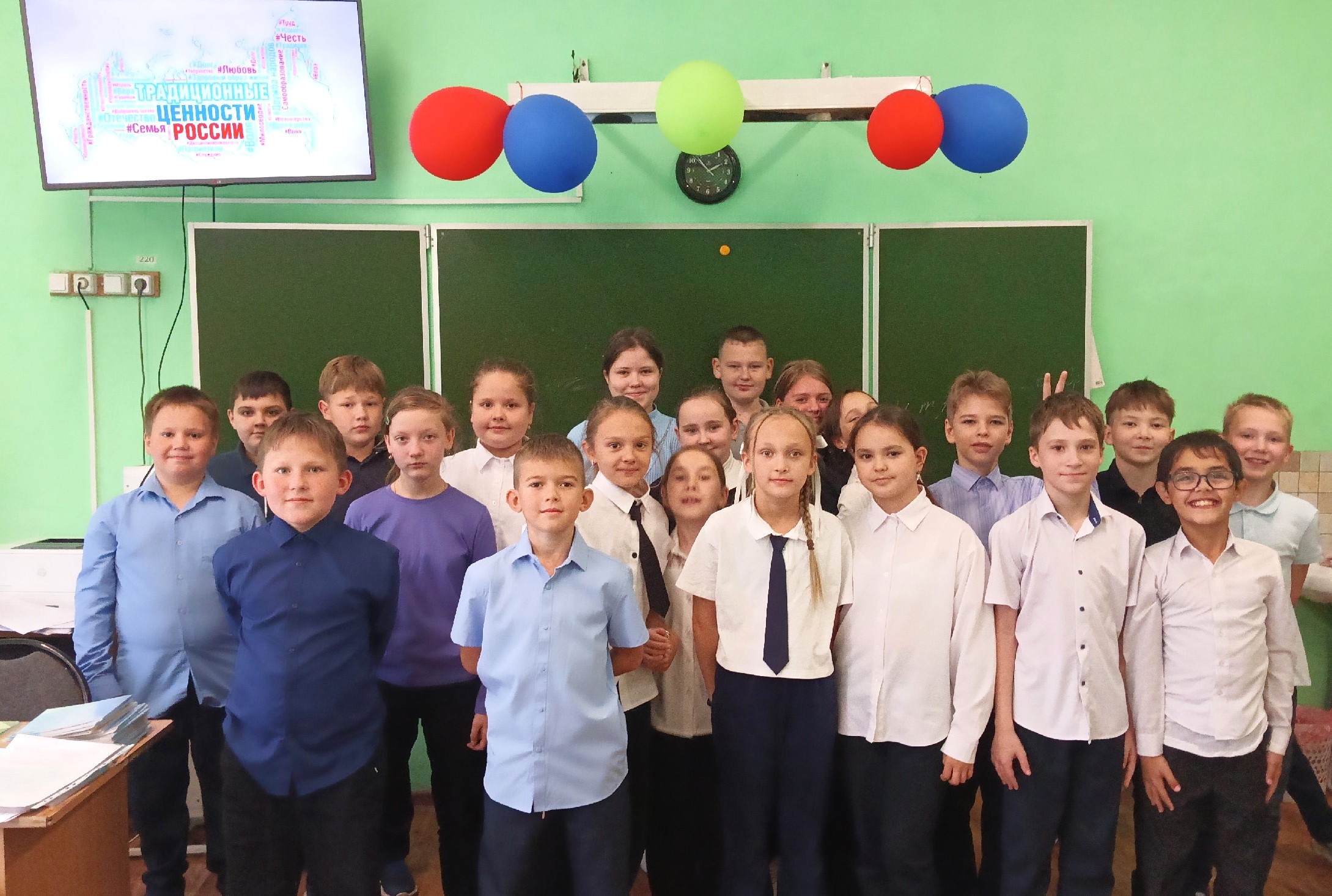 Школьникам была представлена мультимедийная презентация, посвященная традиционным ценностям. Она содержала красочные фотографии народов России, исторических памятников и символики страны. Ведущая рассказала детям о том, что Россия – это страна с богатой историей, что именно благодаря труду народа, Россия стала одной из лидирующих стран в многих направлениях. Она подчеркнула, что труд каждого человека важен и ценен, независимо от его профессии.