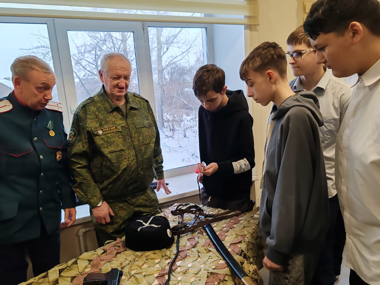 Рассказ дополнила демонстрация казачьего оружия: шашки, нагайки, несколько видов наганов и пистолетов. Об особенностях казацкого оружия рассказали казак, старший вахмистр Сергей Мотунов и казак, участник СВО Александр Лукашов.