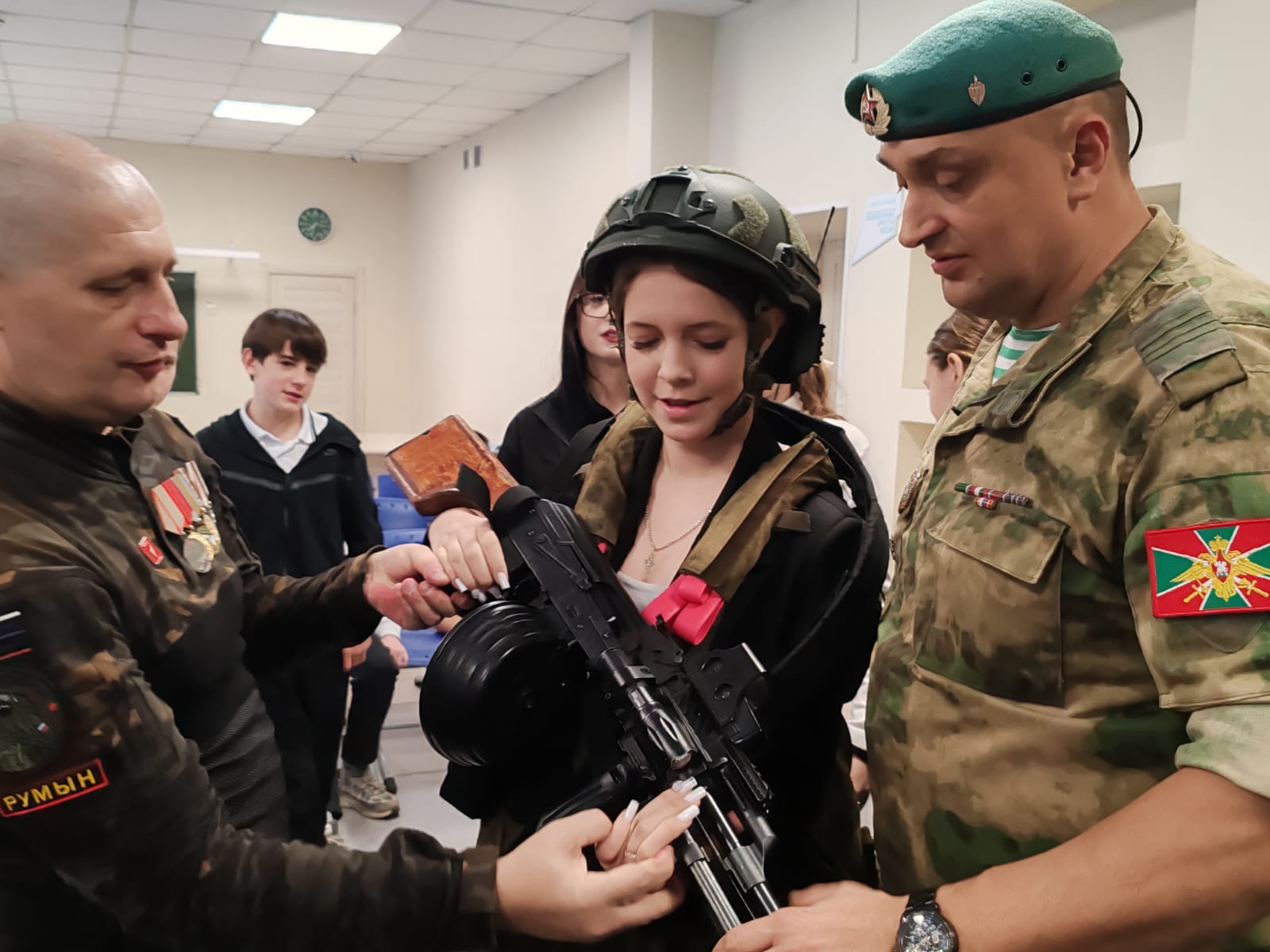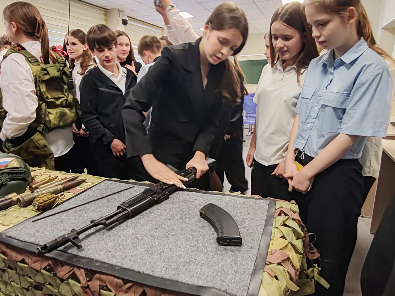 Школьники могли не только потренироваться в разборке и сборке автомата, но и примерить бронежилеты, каски, защитную амуницию, изучить комплектацию технического снаряжения бойцов, пообщаться с гостями. Все это вызвало интерес, как у парней, так и у девочек.