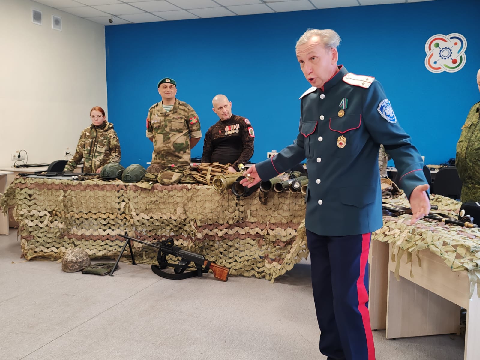От истории казачества перешли к военной истории 20 века. Руководитель волонтерской роты «Боевое братство» по Кемеровской области Александр Коннов продемонстрировал образцы различного боевого оружия, элементы боевого снаряжения российских солдат, в том числе и те, что использовались при боевых действиях в Афганистане и во время Чеченских вооруженных конфликтов. А также технические средства, применяемые в действующих вооруженных силах.
