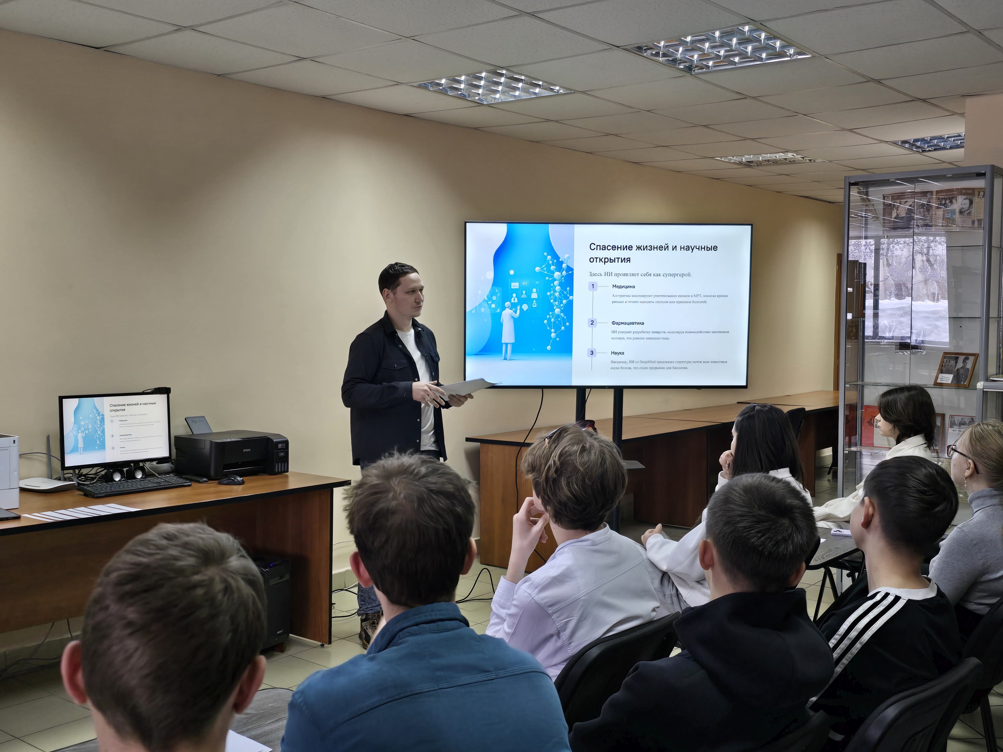 Мероприятие началось с увлекательного рассказа о последних достижениях технологий ИИ, которые активно внедряются в разные сферы нашей повседневной жизни. Участники узнали, как искусственный интеллект помогает врачам ставить диагнозы быстрее и точнее, повышает эффективность производства, улучшает качество образования и облегчает повседневные бытовые заботы.