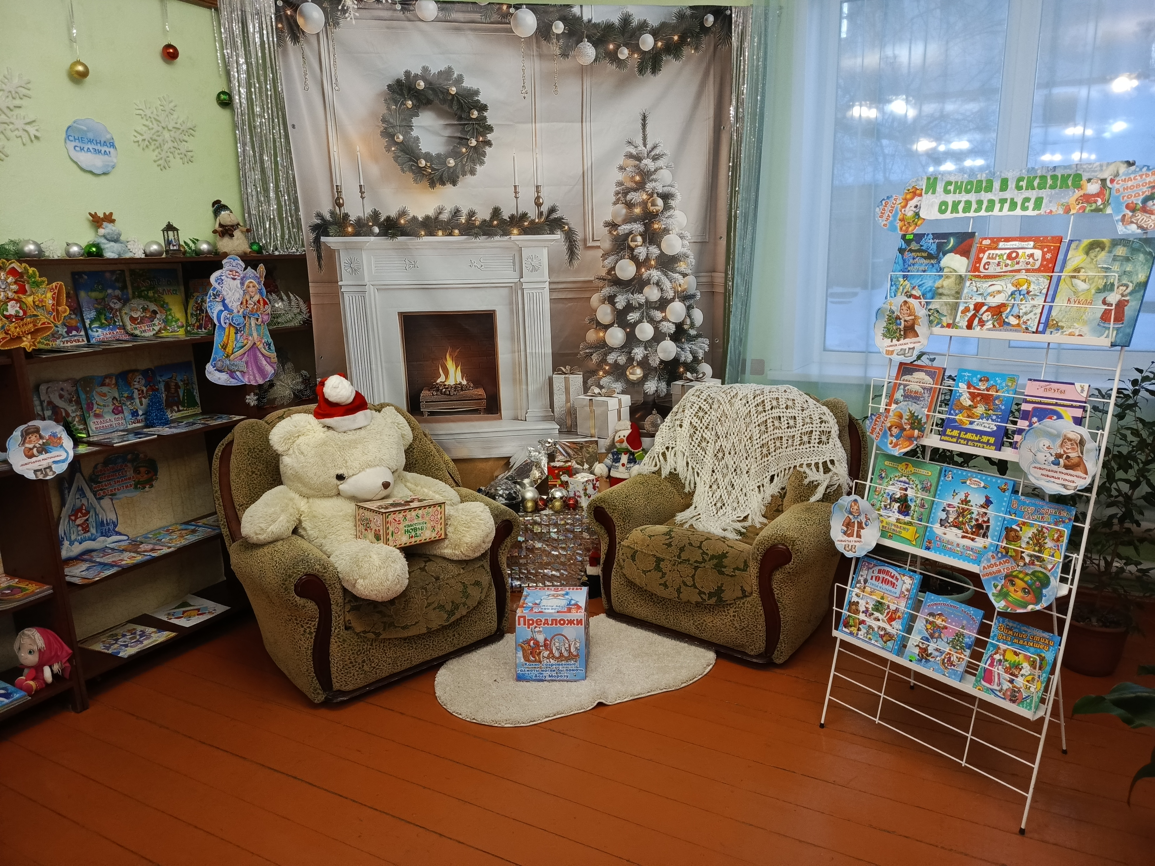 Вместе с семьей и друзьями интересно провести время, окунуться в атмосферу зимней сказки и творчества, поможет оформленная в детской библиотеке-филиале № 6 фотозона «В гостях у Нового года!». Она представлена как домашняя гостиная, в центре которой стоит, камин с искусственным огнем, создающий иллюзию тепла. Вокруг камина расположены удобные кресла с теплой, ажурной шалью, которую приятно накинуть на плечи.