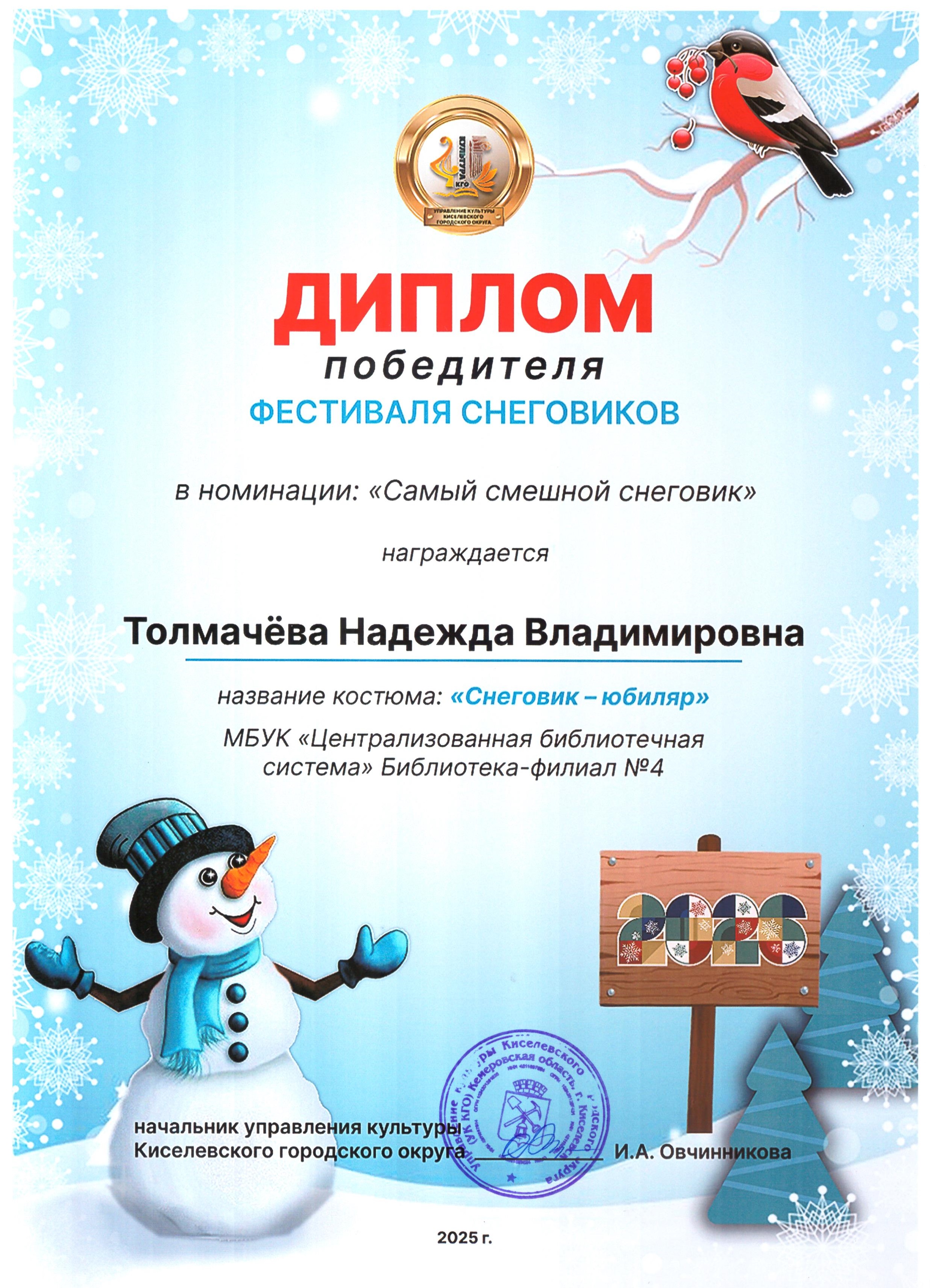 28 декабря специалисты библиотеки-филиала № 4 приняли активное участие в «Фестивале снеговиков – 2025» в рамках народного гуляния «Легенды Снегора и Узорного Кота», представив на фестивале уникального персонажа – Старичка-снеговичка, ровесника города Киселевска.
