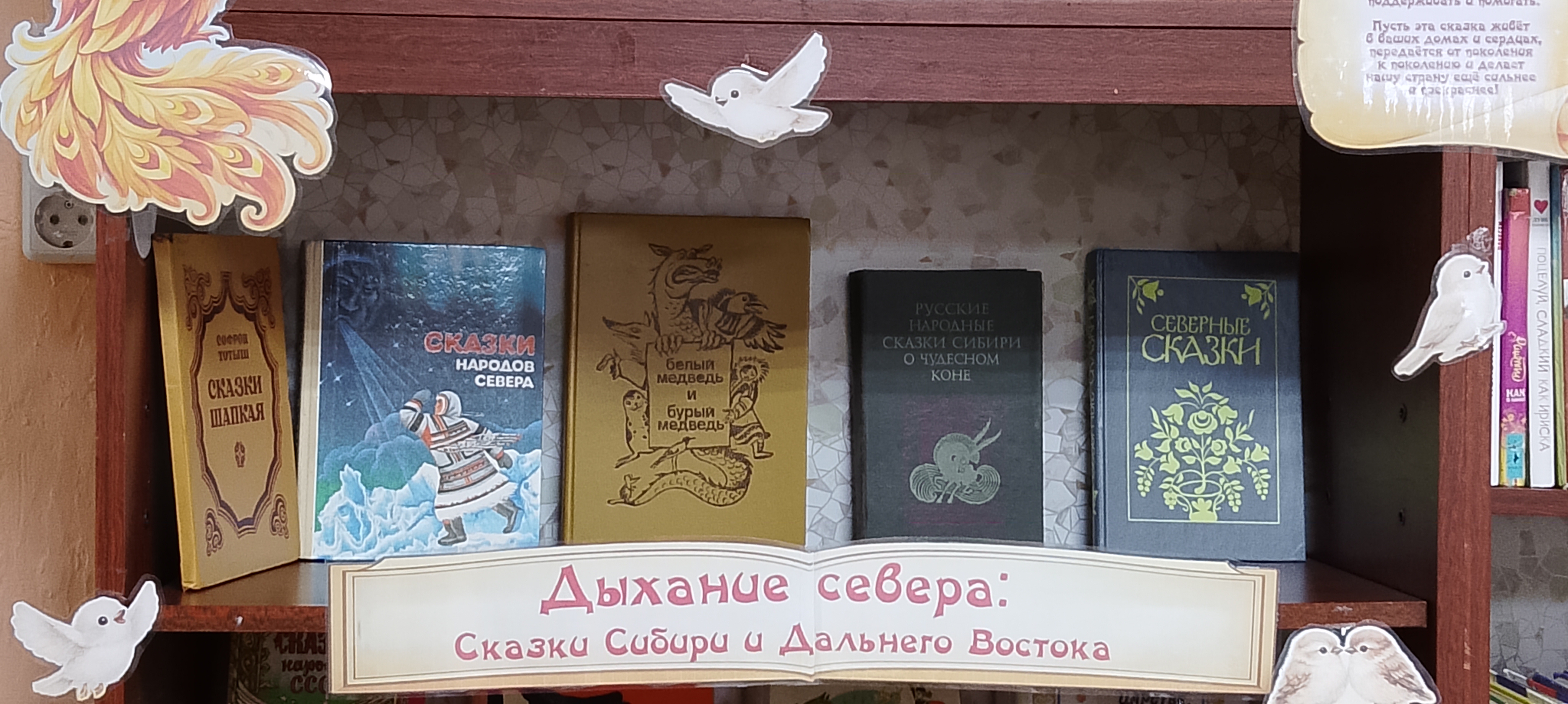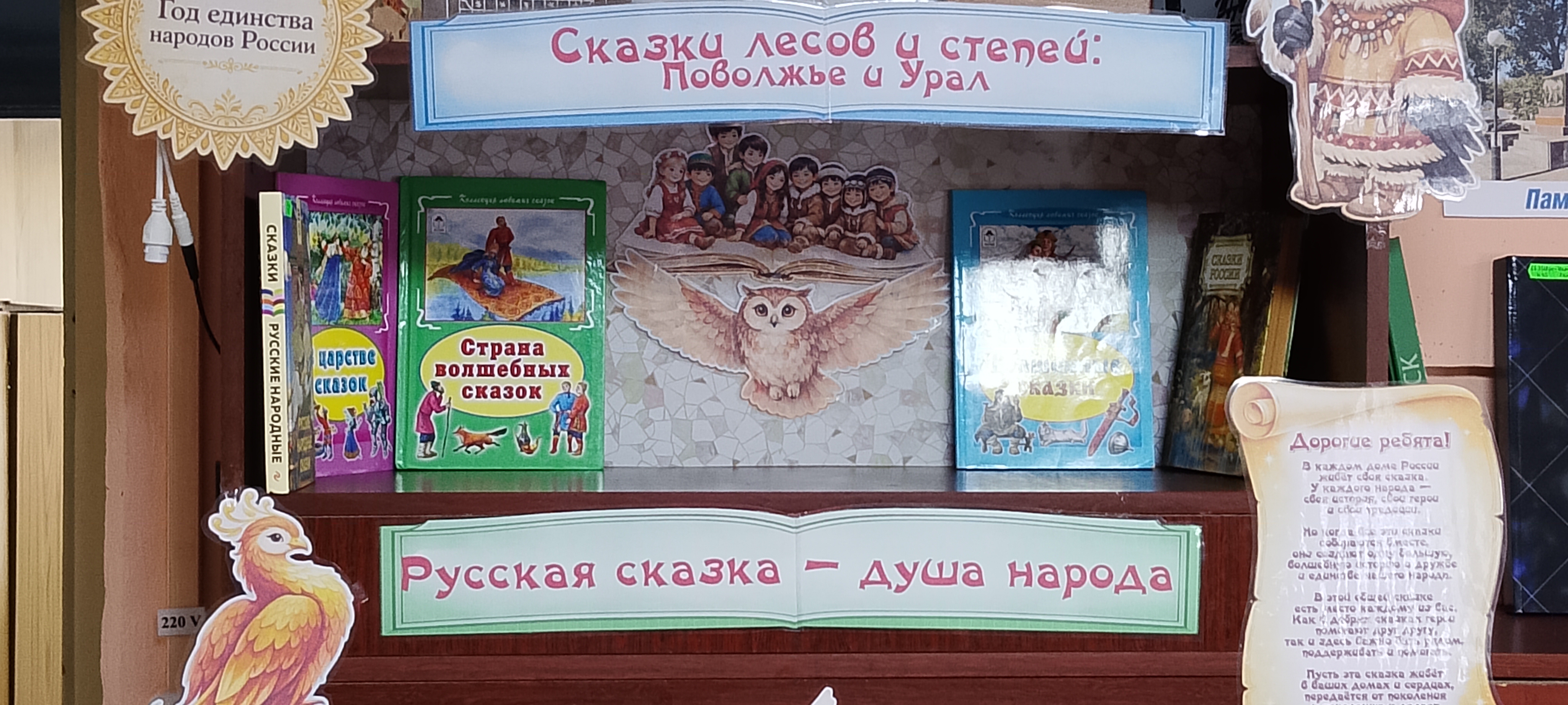 В Год единства народов России на детском абонементе сельской библиотеки-филиала № 10 оформлена книжная иллюстративная выставка «Сказки, в которых живет Россия». Книжная экспозиция приглашает читателей в увлекательное путешествие от заснеженной тундры до кавказских гор.