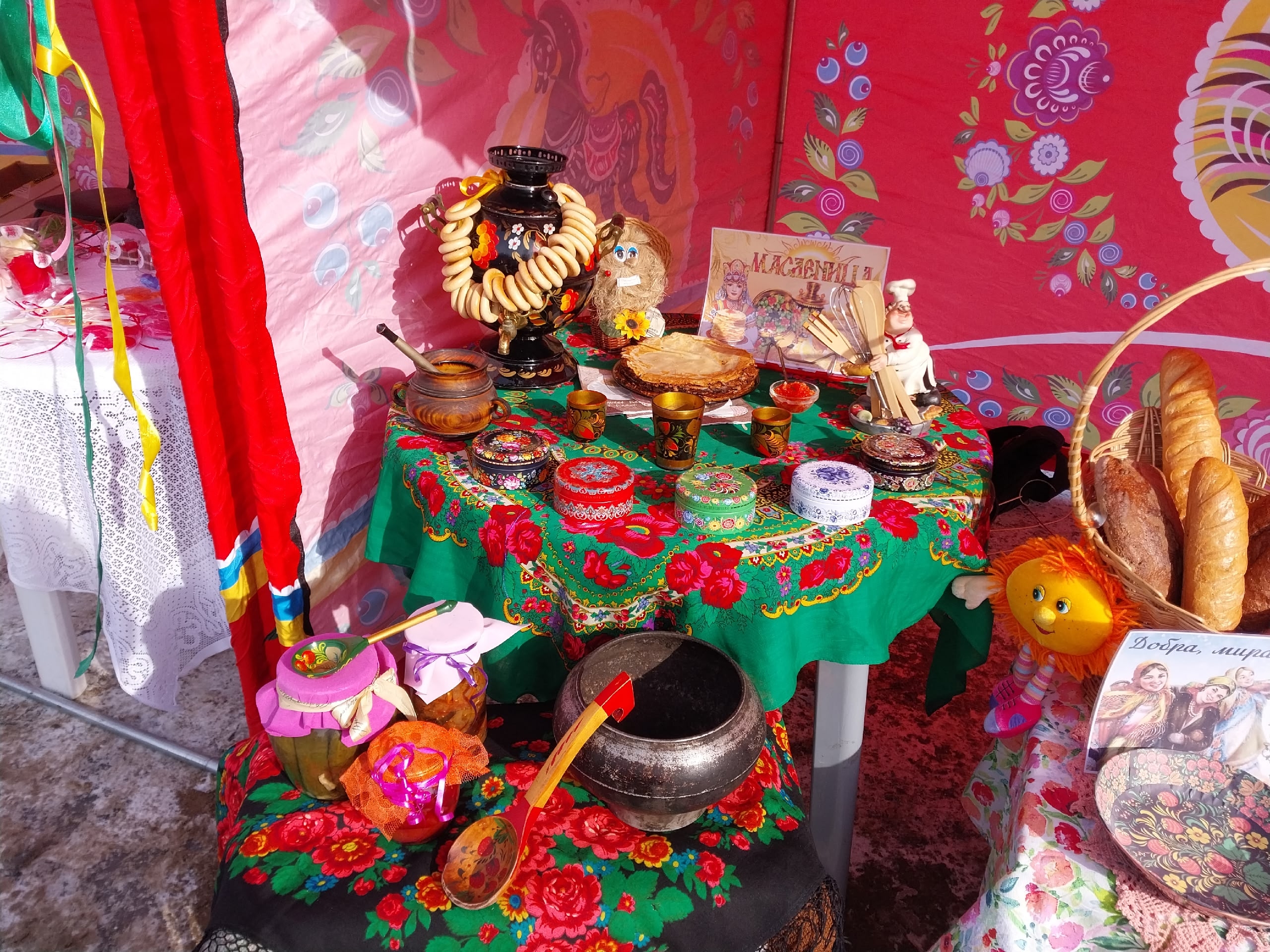 Силами библиотечных специалистов была организована локация, которая погружала гостей в атмосферу русской самобытности и крестьянского антуража. Главными элементами декора стали самовары, фарфоровые чайники, славянские тряпичные куклы, чугунки, самотканые половики, кружевные салфетки, пестрые скатерти, рушники, элементы кухонной утвари. Но и, конечно же, символы масленицы: солнышко, румяные блины, расписные сковороды.