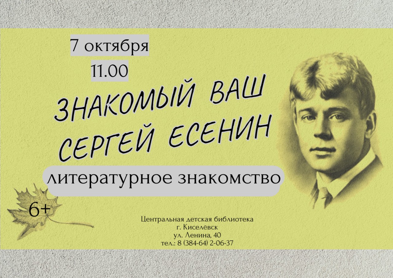 Мероприятие состоится в рамках празднования 130-летия русского поэта Сергея Есенина и будет направлено на знакомство с жизнью и творчеством литератора серебряного века. В программе будут освещены неизвестные факты, представлены фрагменты из художественных и документальных фильмов, созданных по воспоминаниям друзей и знакомых Сергея Александровича, что позволит погрузиться в атмосферу литературных объединений начала 20 века.