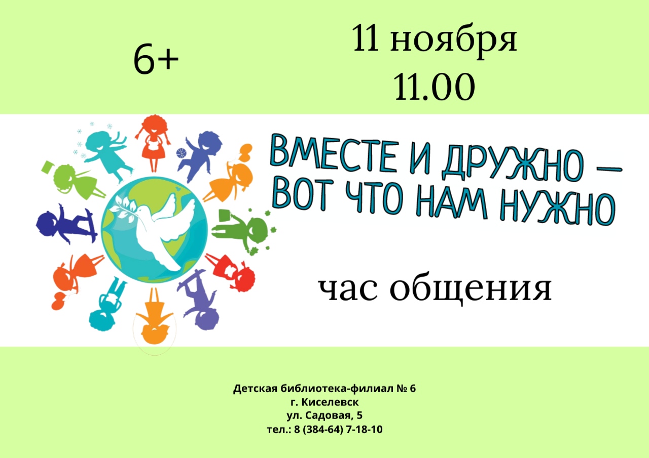 Приглашаем желающих присоединиться к мероприятию, приуроченному к Международному Дню толерантности и вспомнить, что ценность каждого человека – в его уникальности, а сила общества – в уважении к различиям. Для всех прозвучат важные слова о книге, как лучшем проводнике в мир других культур, характеров и точек зрения. Участников часа общения ждут увлекательные игры и упражнения, которые помогут посмотреть на мир глазами другого человека, научат понимать друг друга без слов.