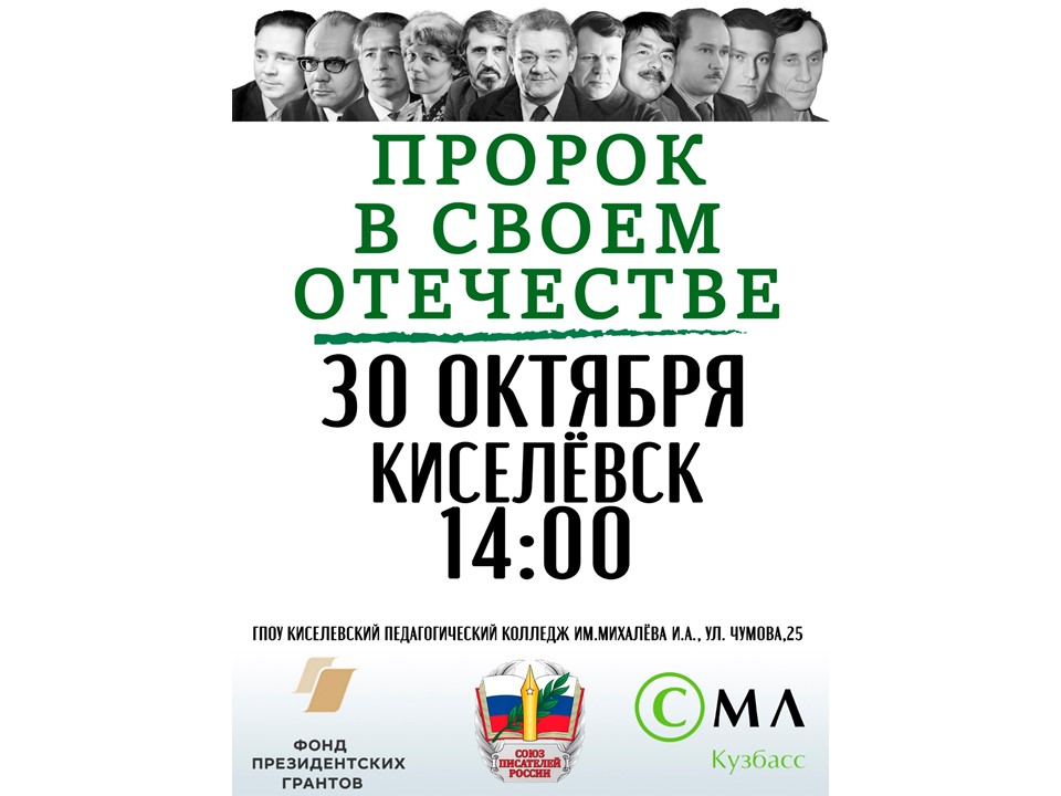 Дорогие друзья! В четверг, 30 октября, в Киселёвске пройдёт тринадцатая встреча в рамках образовательно-просветительского проекта Кемеровского областного отделения Союза писателей России и Совета молодых литераторов Кузбасса «Пророк в своём Отечестве».
