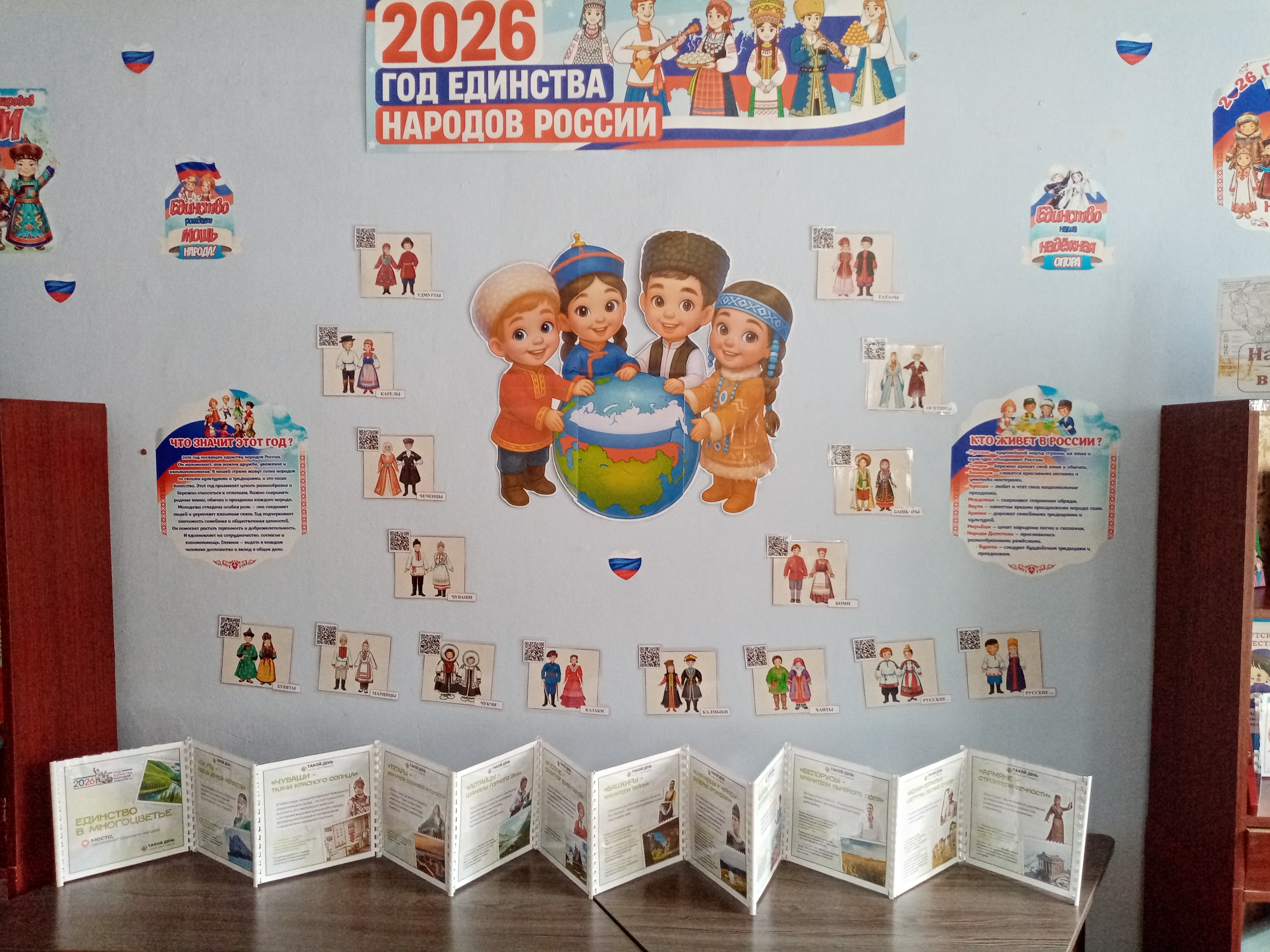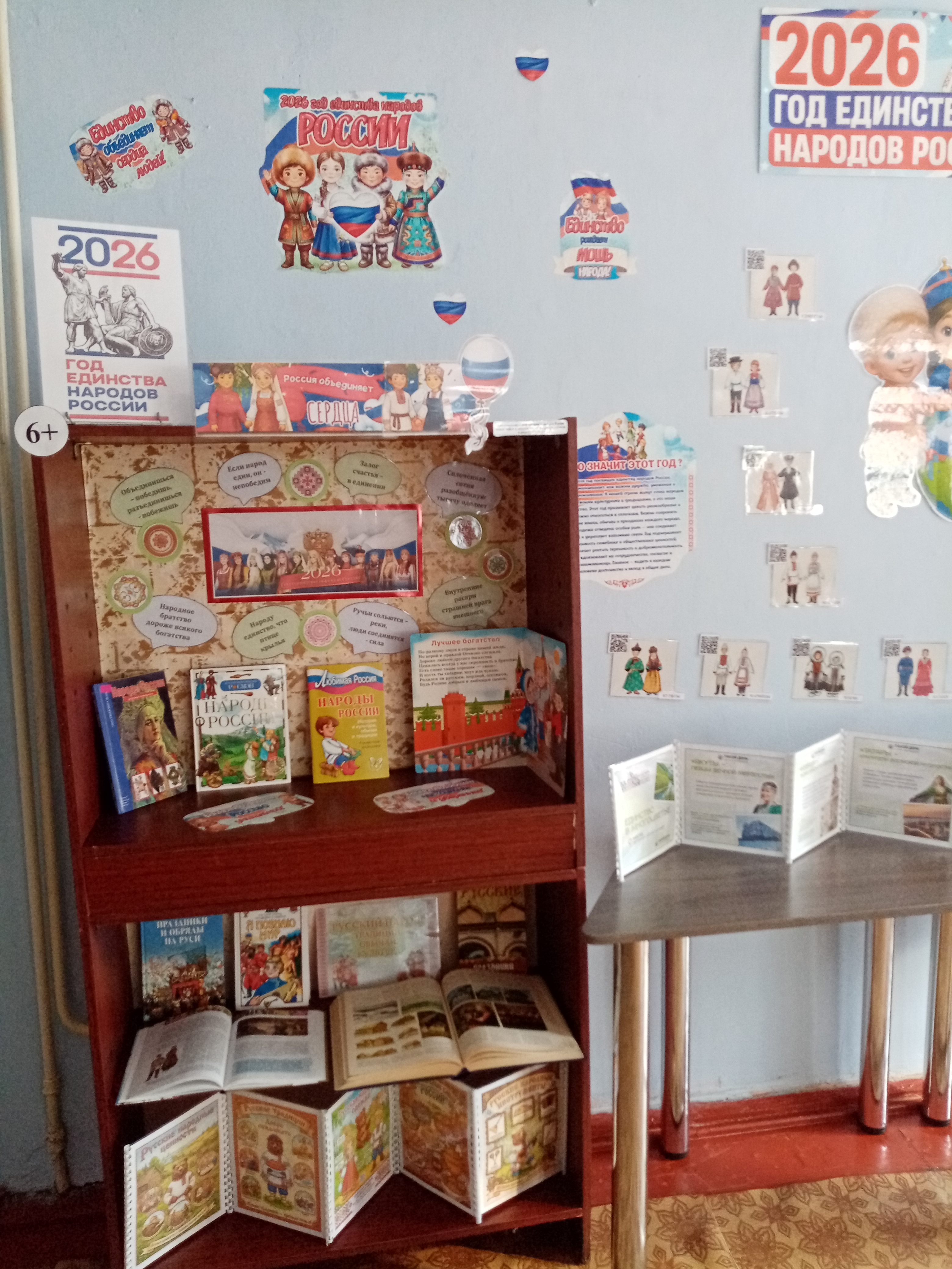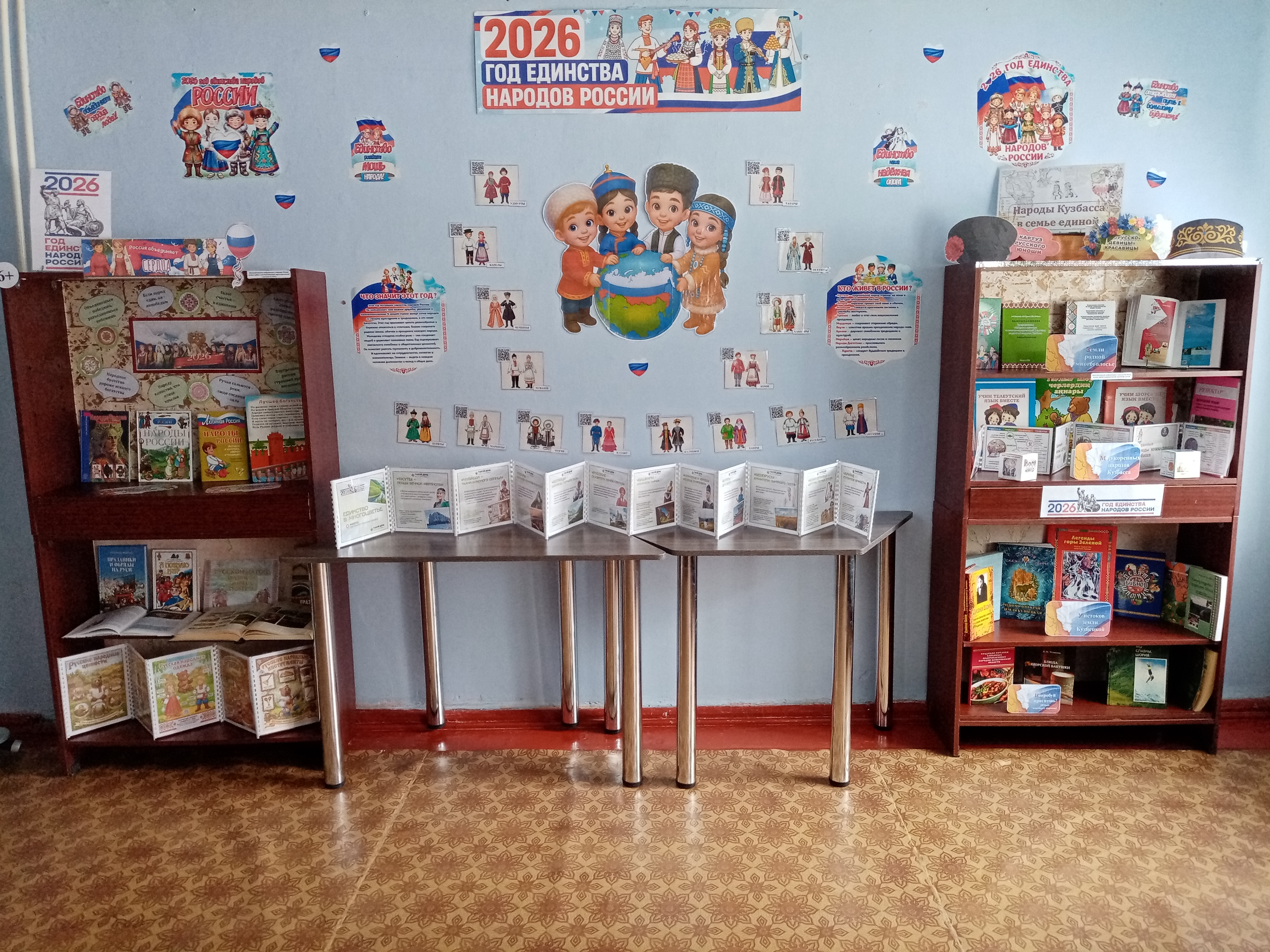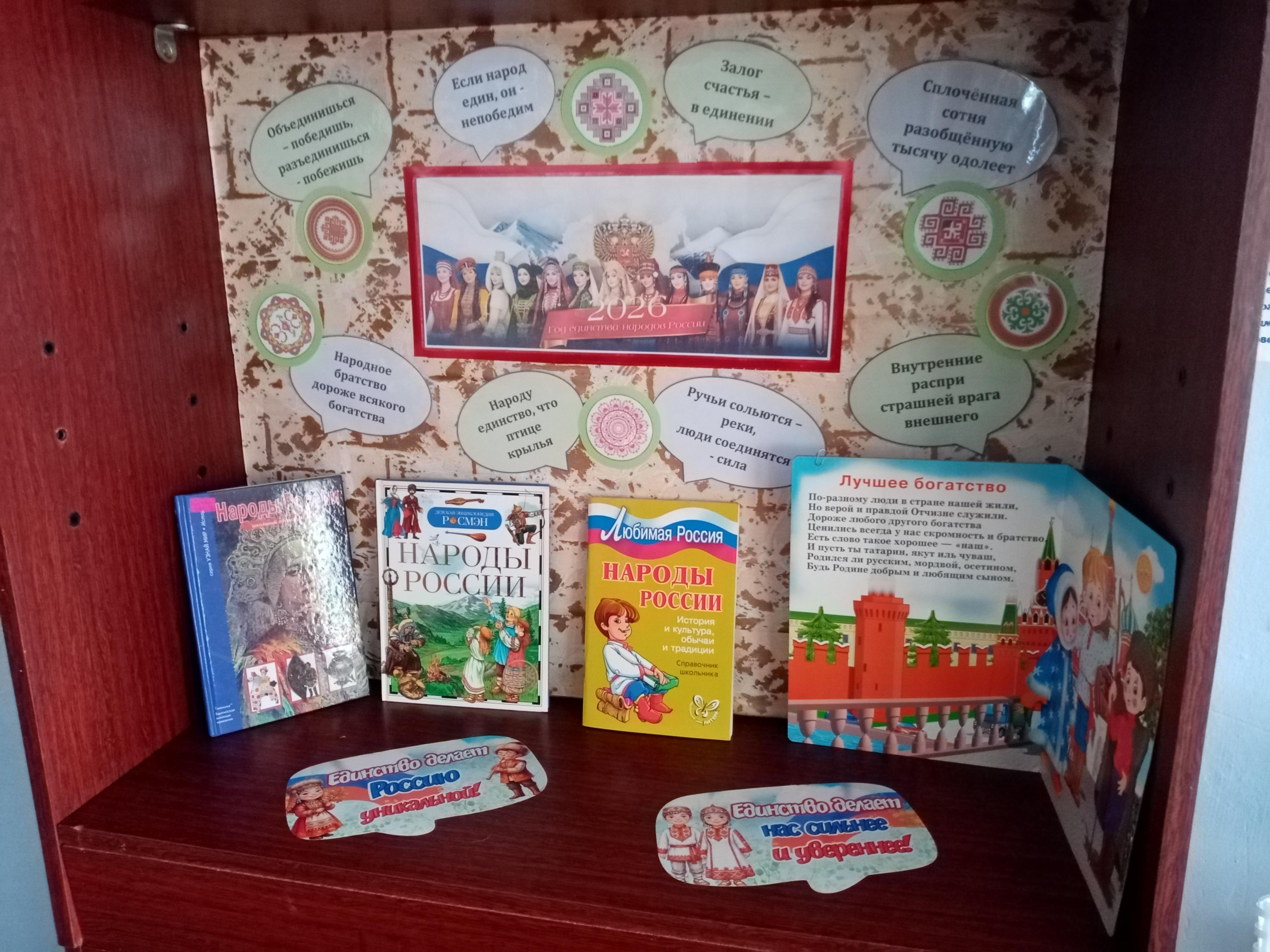 В честь данного события в библиотеке-филиале № 1 оформлена интерактивная книжно-информационная выставка «2026 – Год единства народов России».