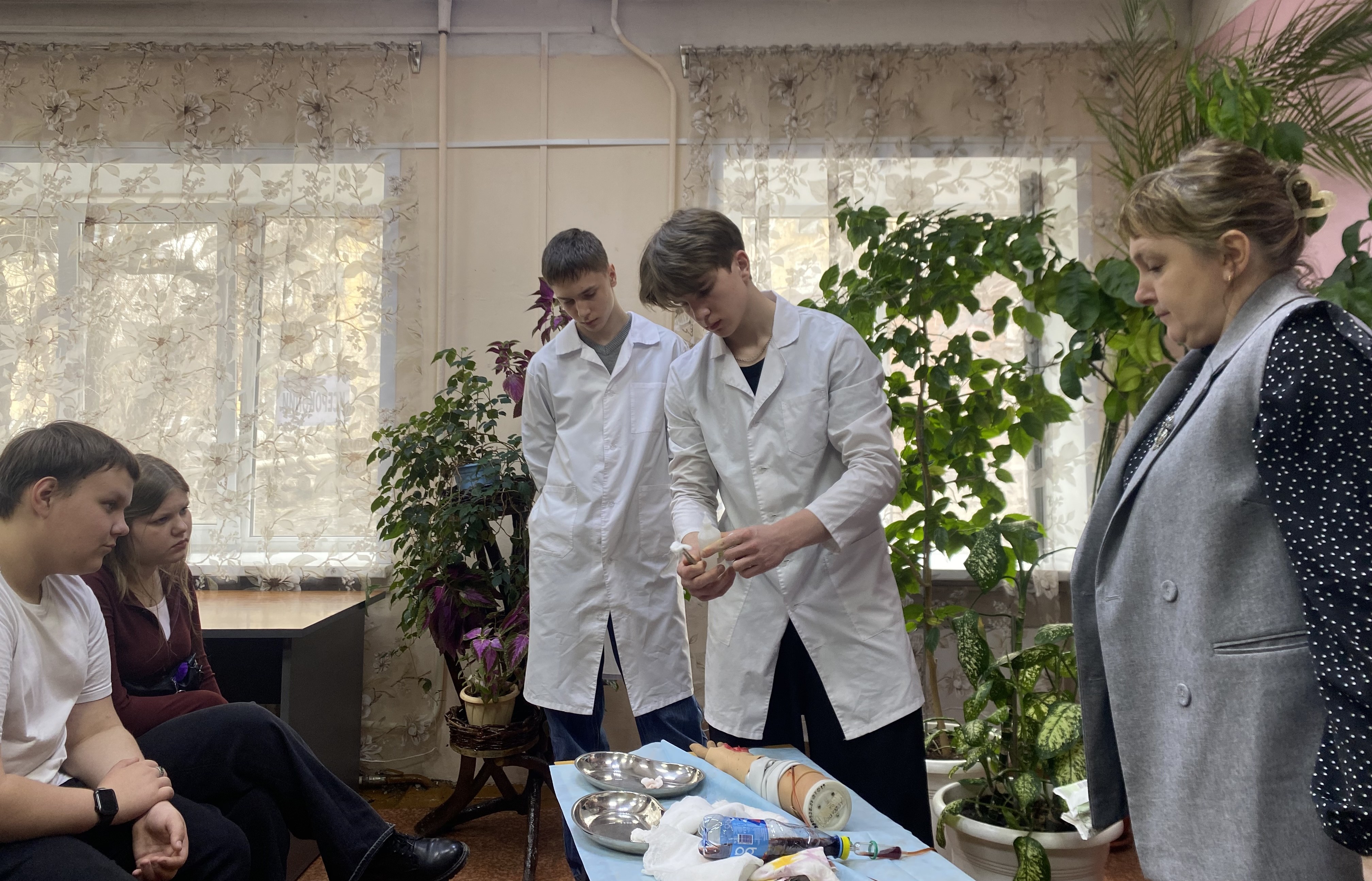 Практическая часть вызвала у школьников особый интерес. Под руководством будущих медиков участники встречи смогли отработать на муляже наложение жгутов и остановку кровотечения.