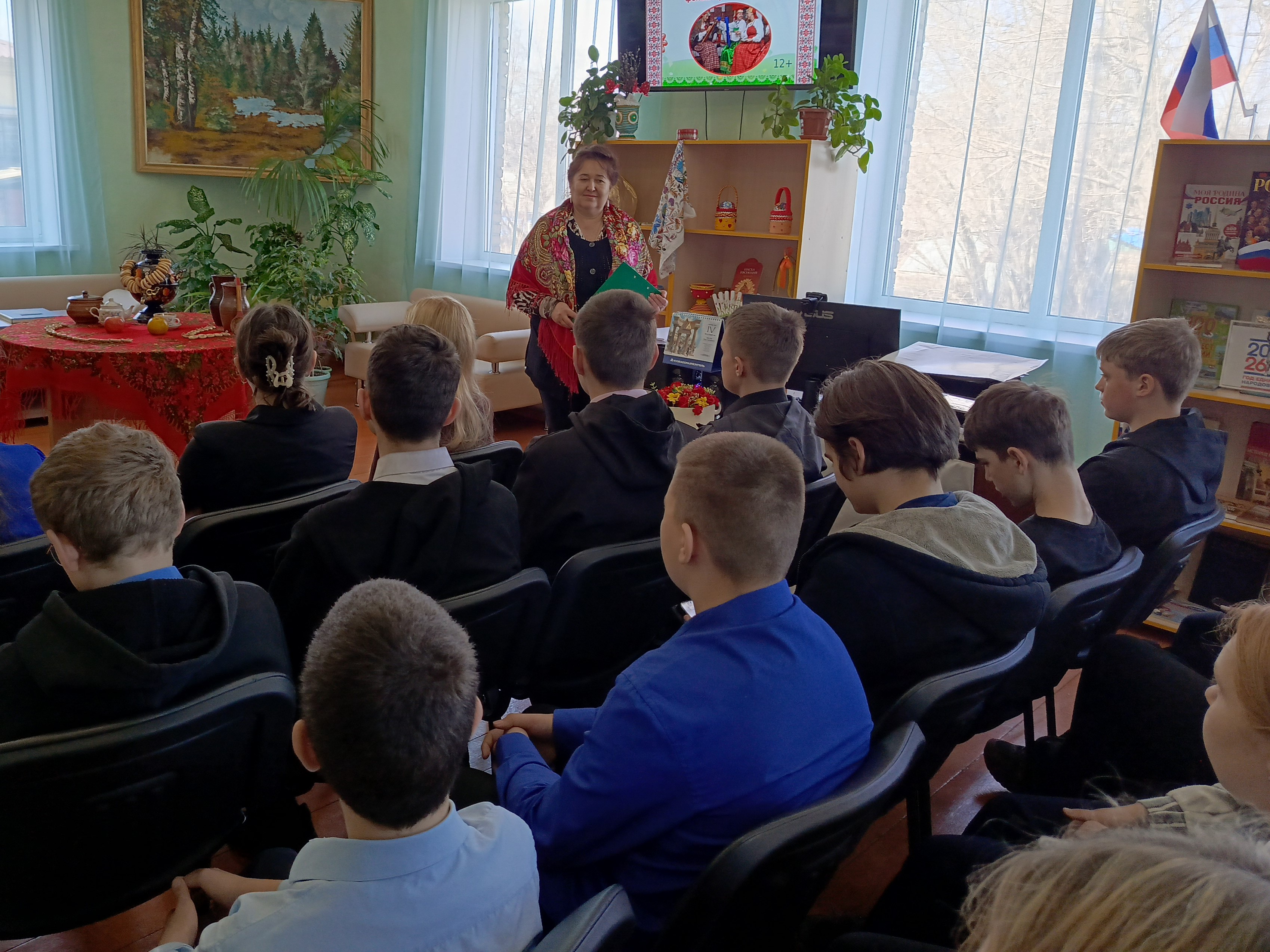 В ходе встречи сотрудники библиотеки познакомили школьников с богатством и самобытностью русской традиционной культуры. Ребята узнали, как жили их предки, познакомились с народными песнями, костюмами, старинными играми и преданиями.