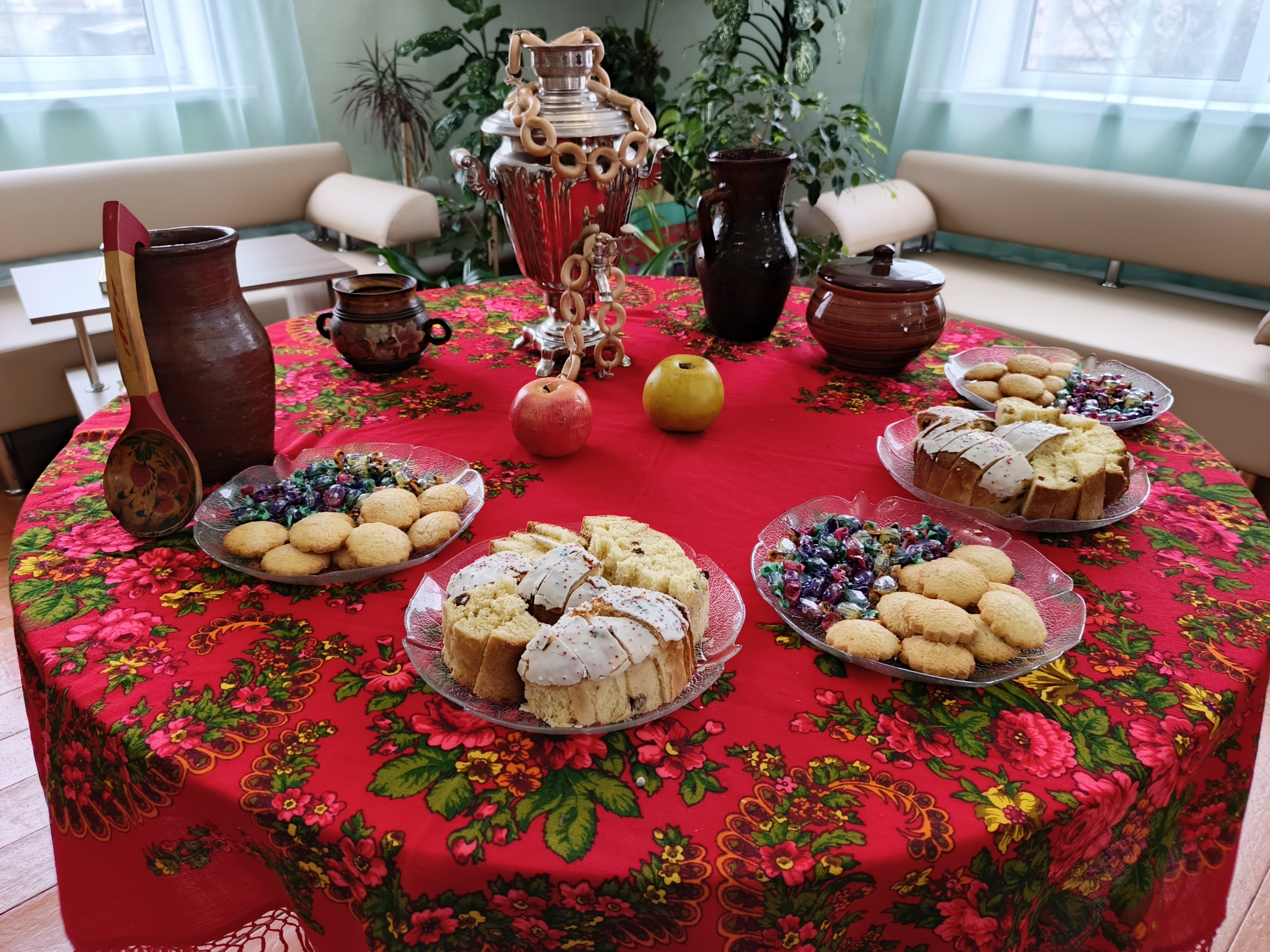 Центральным аккордом программы мероприятия стала общая трапеза, зазвучал старый самовар. В теплой беседе участники делились семейными рецептами, вспомнили, как праздновали Пасху, играли и пели народные песни. За чашкой травяного чая с пасхальными пряниками мальчишки и девчонки поделились и своими ритуалами: кто-то красил яйца в луковой шелухе, кто-то вместе с мамой готовил маленькие куличи для каждого члена семьи, а кто-то хранит освященную вербу до следующей Пасхи. Присутствующие взрослые вспомнили своих бабушек и детство, когда столы ломились от угощений, как в произведении Ивана Шмелева «Лето Господне», в котором ждали Пасху в старой Москве и какие богатые были столы.